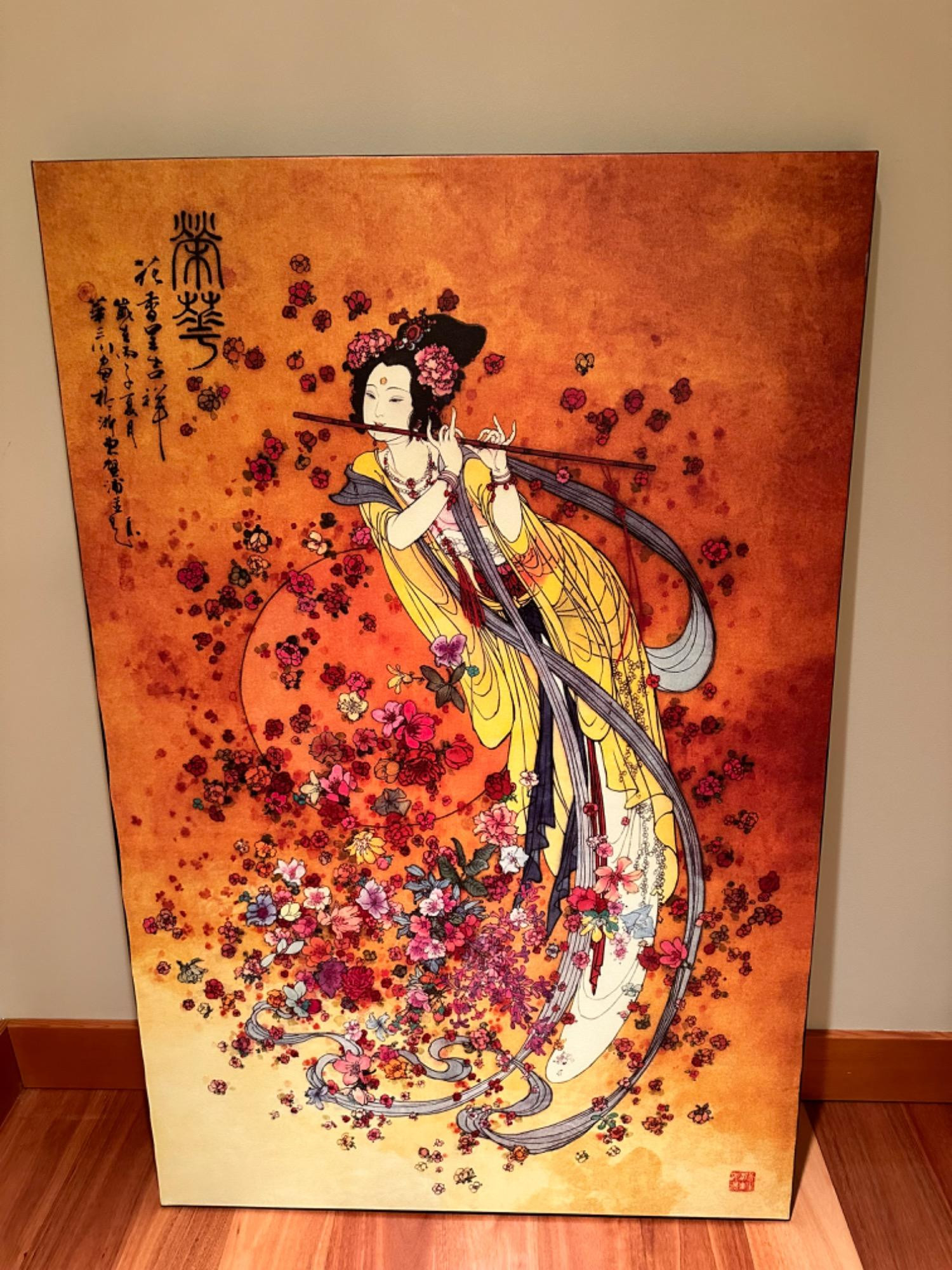 An Asian-inspired print on canvas depicting the Goddess of Prosperity and Wealth. Traditional Asian artistic representation Theme of prosperity and wealth Vibrant and culturally significant imagery Approximately measuring 54 x 35.5 inches.