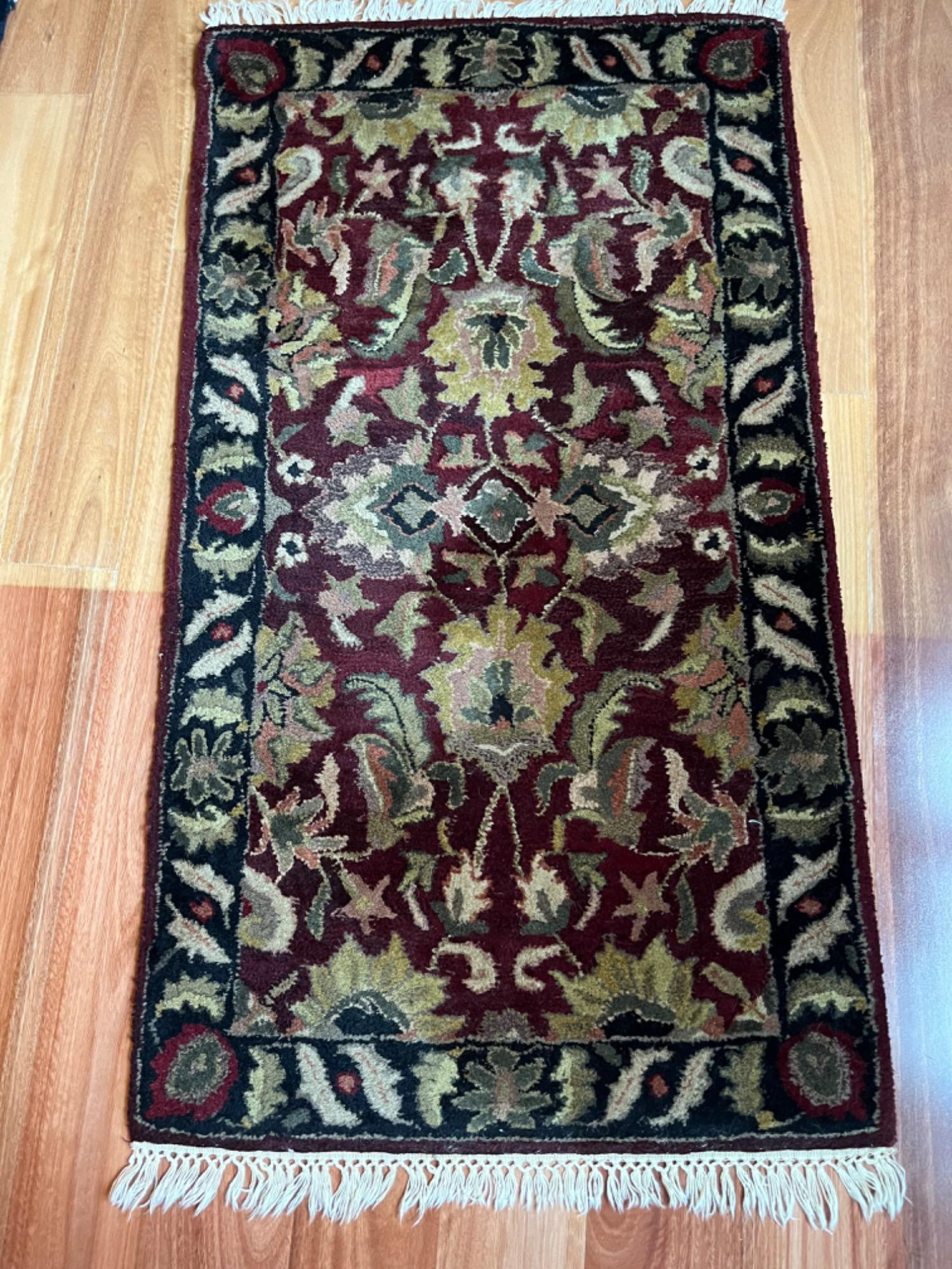 Handcrafted Traditional Sarouk Style India Woolen Rug. A handmade Indian wool rug with a 100% woolen pile. Intricate patterns with symmetrical designs Traditional Indian motifs in shades of wine field, green, and beige-black border Detailed borders with complementary motifs Finished with white fringes at both ends