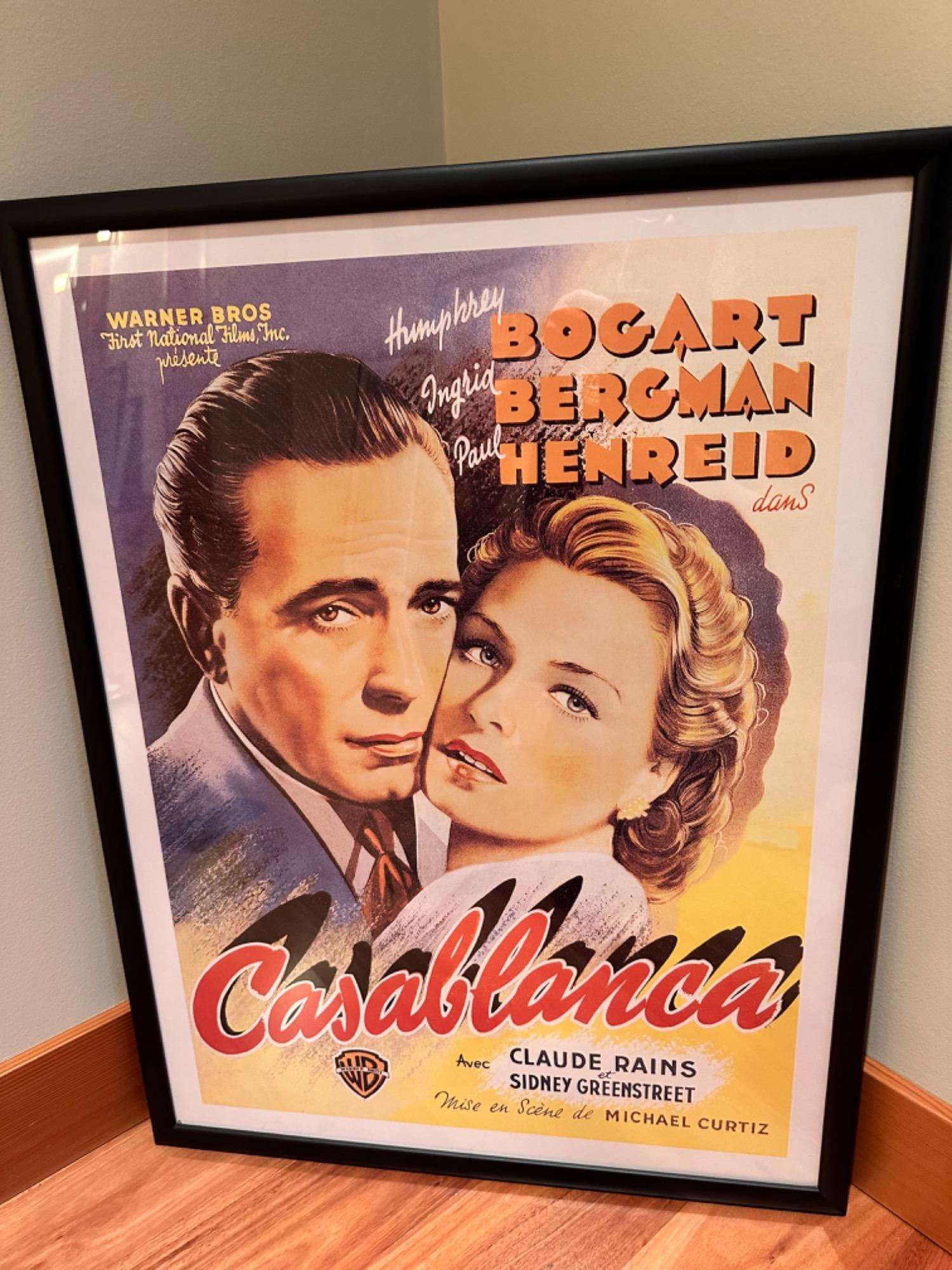 A framed poster of the classic film “Casablanca.”Reproduction Includes names of iconic actors: Humphrey Bogart, Ingrid Bergman, and Claude Rains. Produced by Warner Bros. and directed by Michael Curtiz. Represents a significant piece of cinematic history. Paper or cardstock, typical for movie posters.