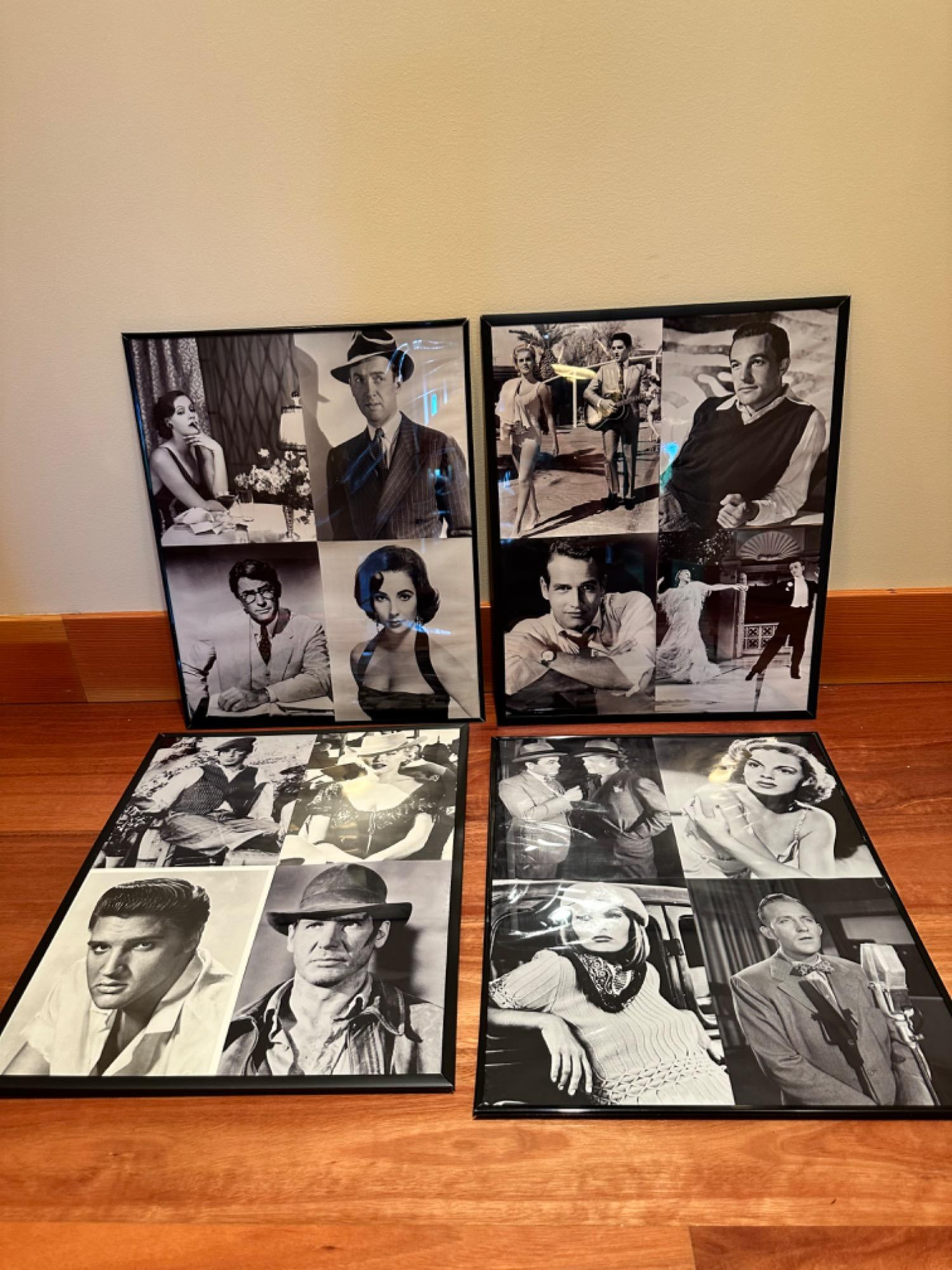 Vintage Hollywood Legends Still Print Collages Framed photo print collages of black and white 8 x 10 featuring iconic 20th-century celebrities. High-profile celebrities: Includes Al Pacino, Marilyn Monroe, Elvis Presley, Harrison Ford, Paul Newman, Gene Kelly, Greta Garbo, Gregory Peck, James Stewart, Judy Garland, Elizabeth Taylor, Bing Crosby, Fred Astaire, Ginger Rogers, Edward G. Robinson, James Cagney, and others. Features stars from classic films and entertainment. Ideal for enthusiasts of vintage Hollywood memorabilia. Photographic paper encased within plexi-glass