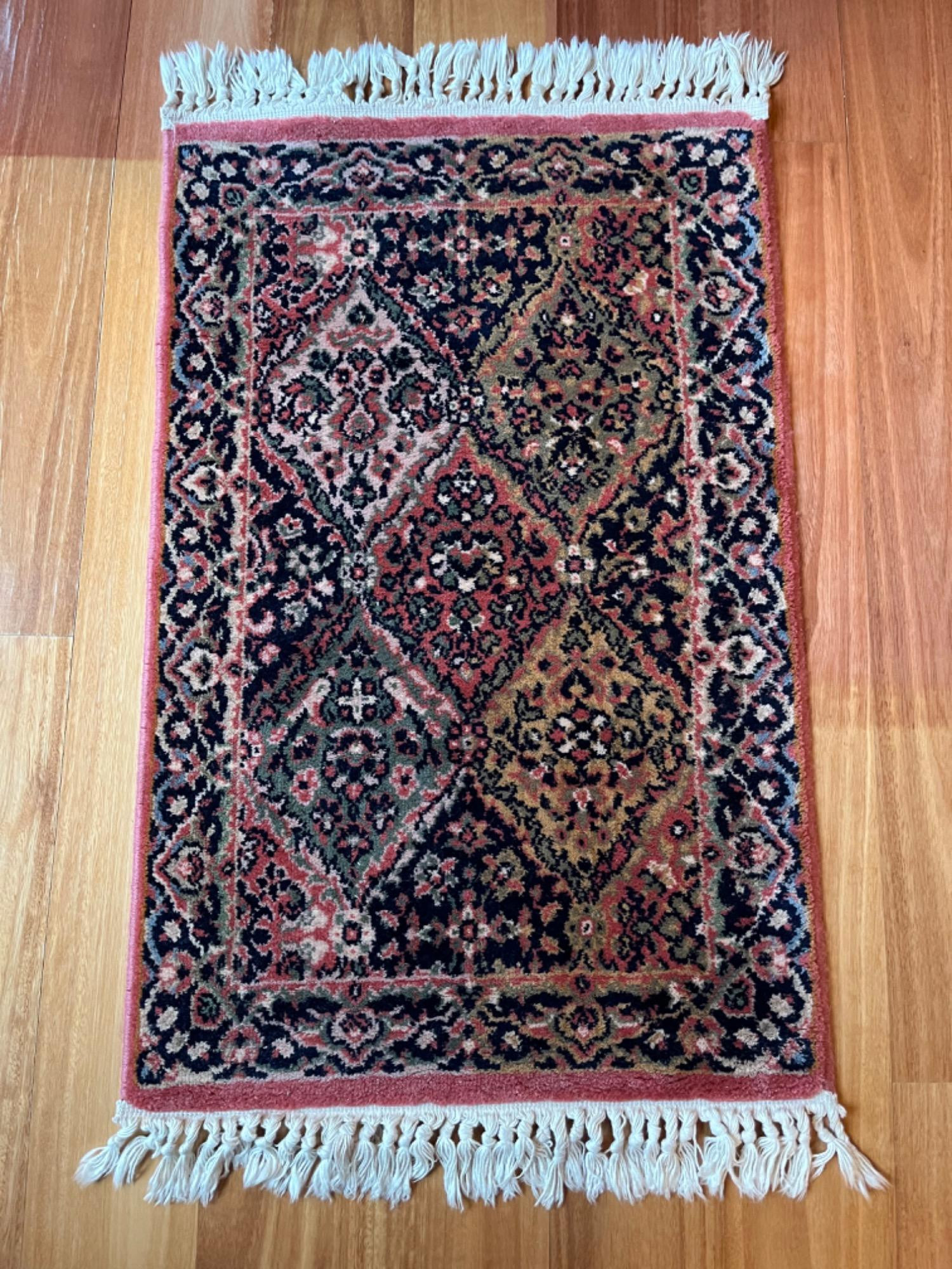 Charming Pink Woolen Rug with Ornate Geometric-Floral Design This is a woolen rug featuring intricate geometric and floral patterns. Charming appearance. Ornate design with detailed patterns. Finished with white fringes on the shorter ends. Made of wool.