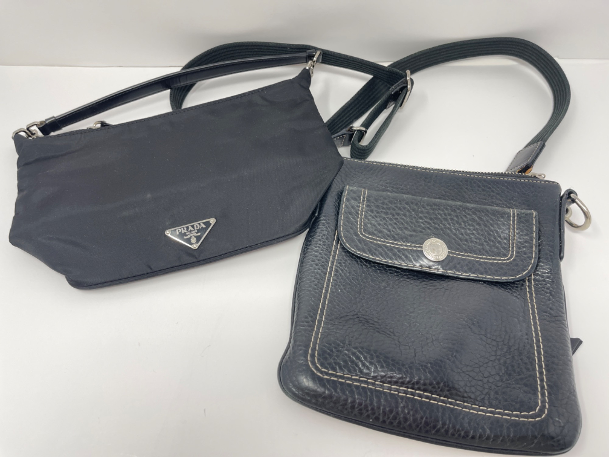 Designer Duo: Prada Nylon Shoulder Bag and Coach Leather Purse Prada Nylon Shoulder Bag: A black nylon shoulder bag with the iconic silver triangular logo plaque on the front. Zipper closure Made of durable nylon. Made in Italy Coach Leather Purse: A black leather purse with a flap closure featuring a circular silver-tone clasp. Flap with clasp closure Made of high-quality leather. Appears gently used Prada: 10” W x 6” H Coach: 7.5” W x 8.5” H