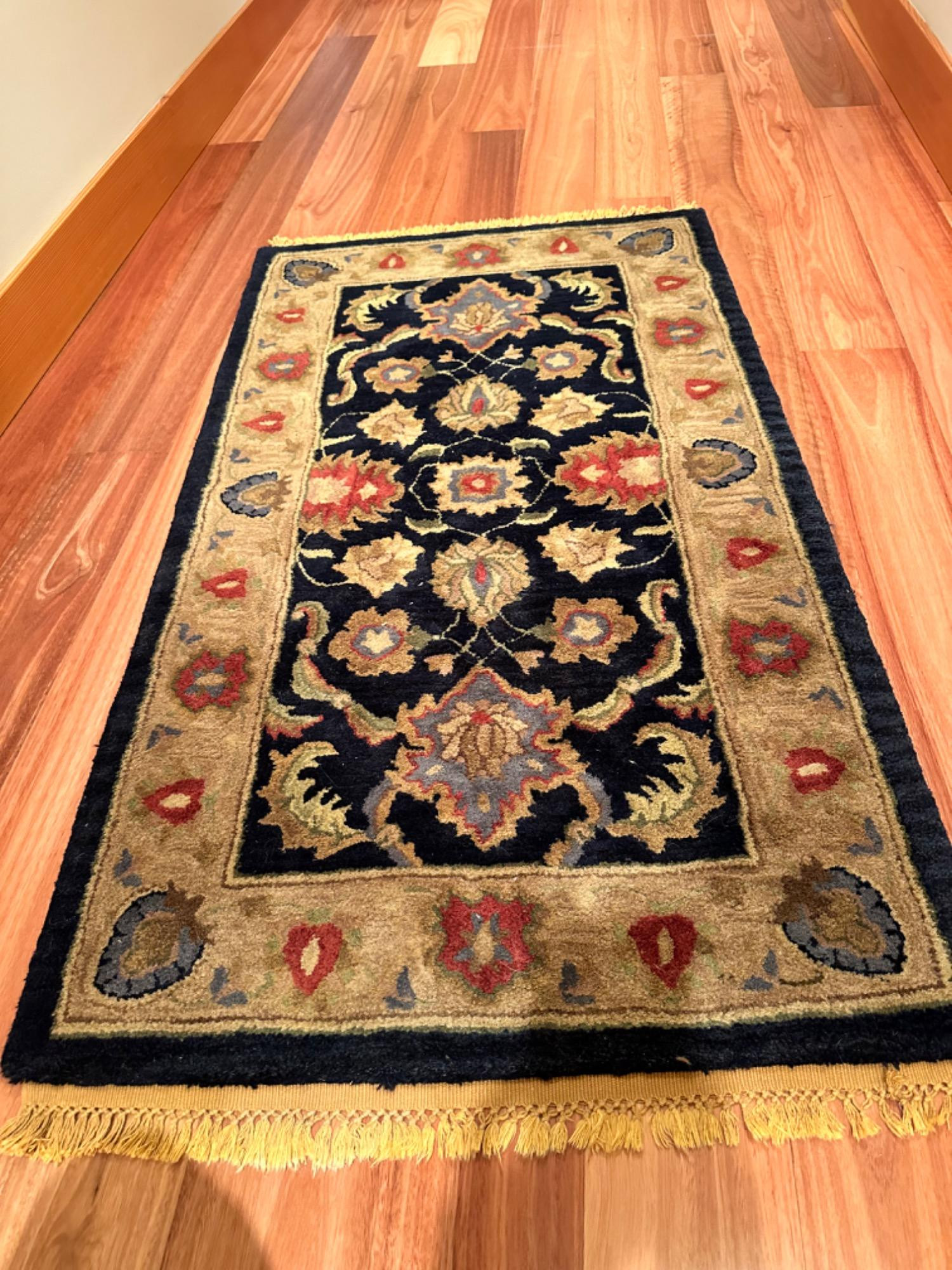 A rectangular wool pile rug with intricate floral patterns, ornate borders, and fringe detailing. 100% wool pile Floral patterns with ornate borders Dark blue, beige, red, pink, and green Made in India