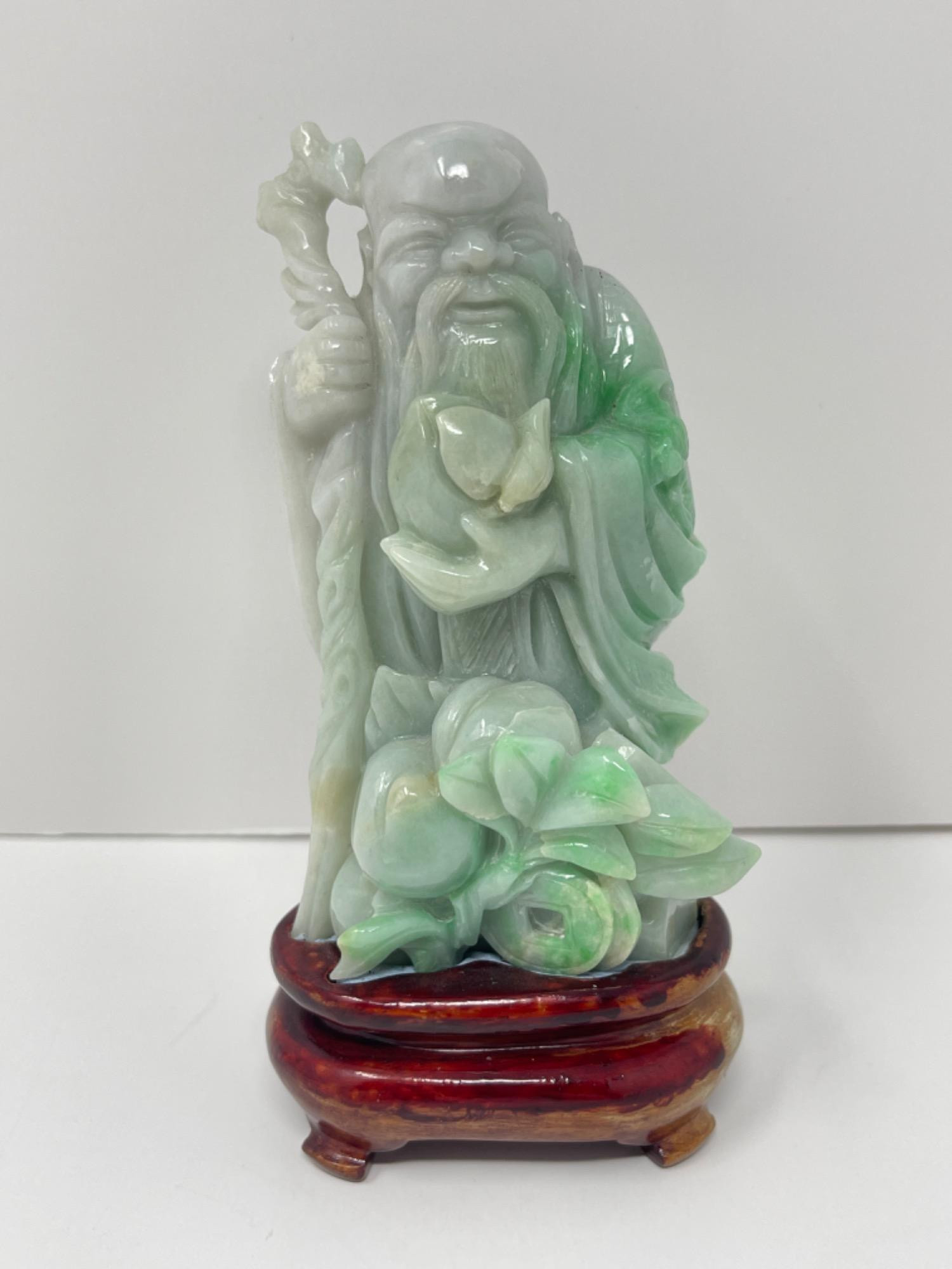 Jadeite Shou Lao God Of Longevity Figure On Wood Base. A jadeite sculpture depicting Shou Lao, the Chinese god of longevity, mounted on a wooden base. Jadeite Shou Lao, god of longevity Intricate carving with flowing robes and a staff Polished wooden base
