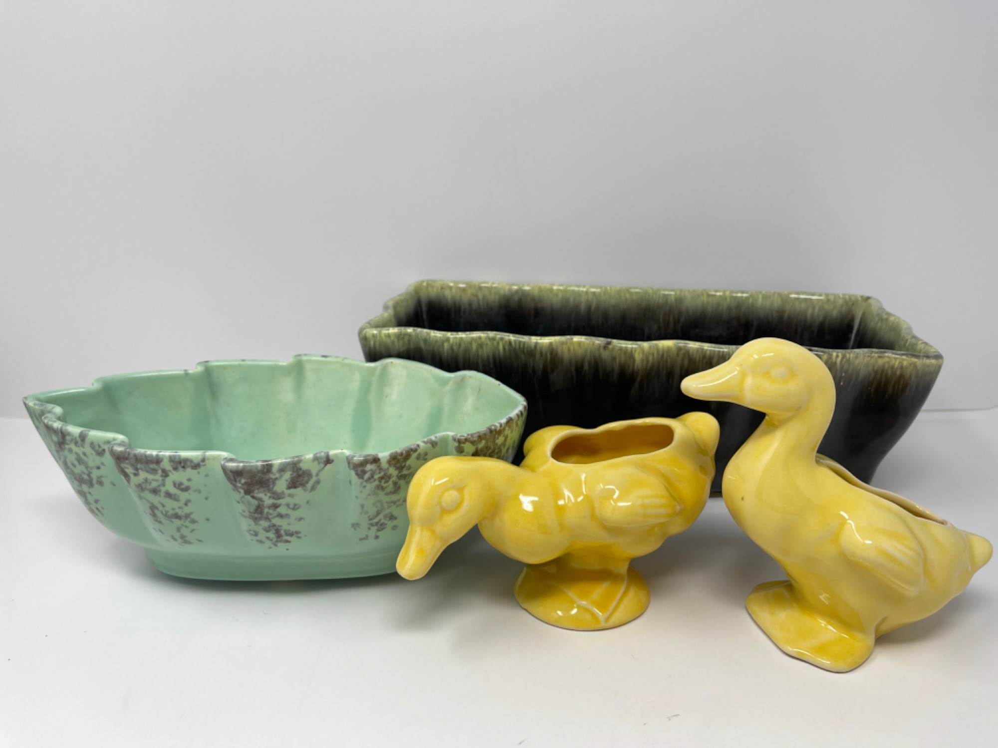 Two ceramic bowls with pastel glaze (green and brownish-green) Two glossy yellow duck figurines Vintage ceramic items Distinctive retro style Collectible potential Glazed earthenware or stoneware Tallest: 5” H