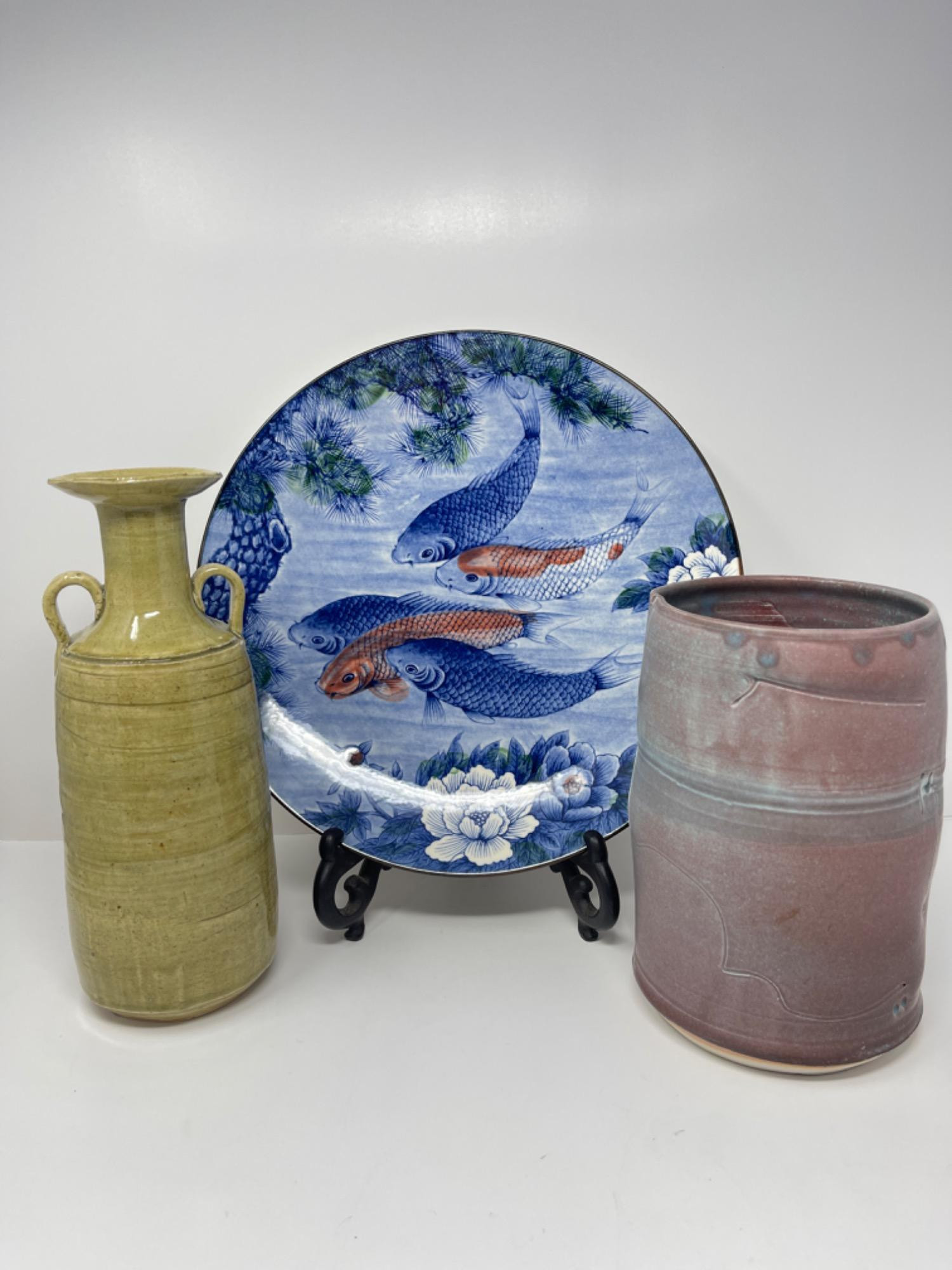 Handcrafted Features vibrant koi fish plate design, symbolizing good fortune and prosperity. Tall jug, slender with handles, showcasing traditional craftsmanship. Cylindrical vase with earthy glaze, highlighting skilled ceramic techniques. Signed Ceramic made Smallest: 8” H Largest: 12” H Display plate stand NOT included some minor staining and cracking