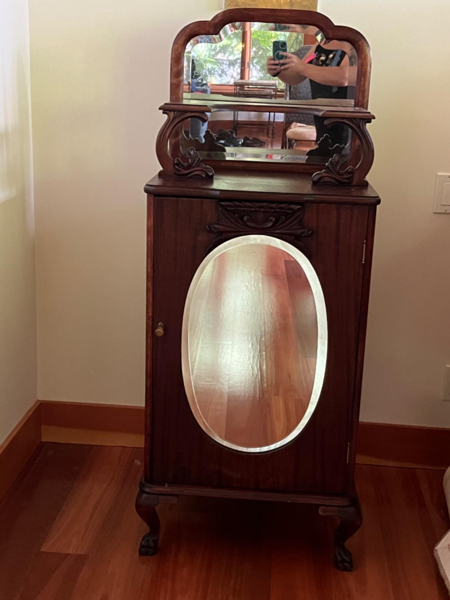 Antique sheet music cabinet with ornate carvings and a beveled mirror Tall wooden cabinet with a single door featuring an oval-shaped glass panel Ornate carvings and curved legs Beveled mirror on the top section Mahogany wood Likely from the Victorian era, used for organizing and displaying sheet music Reflects the craftsmanship and design aesthetics of the period Shelves removed.