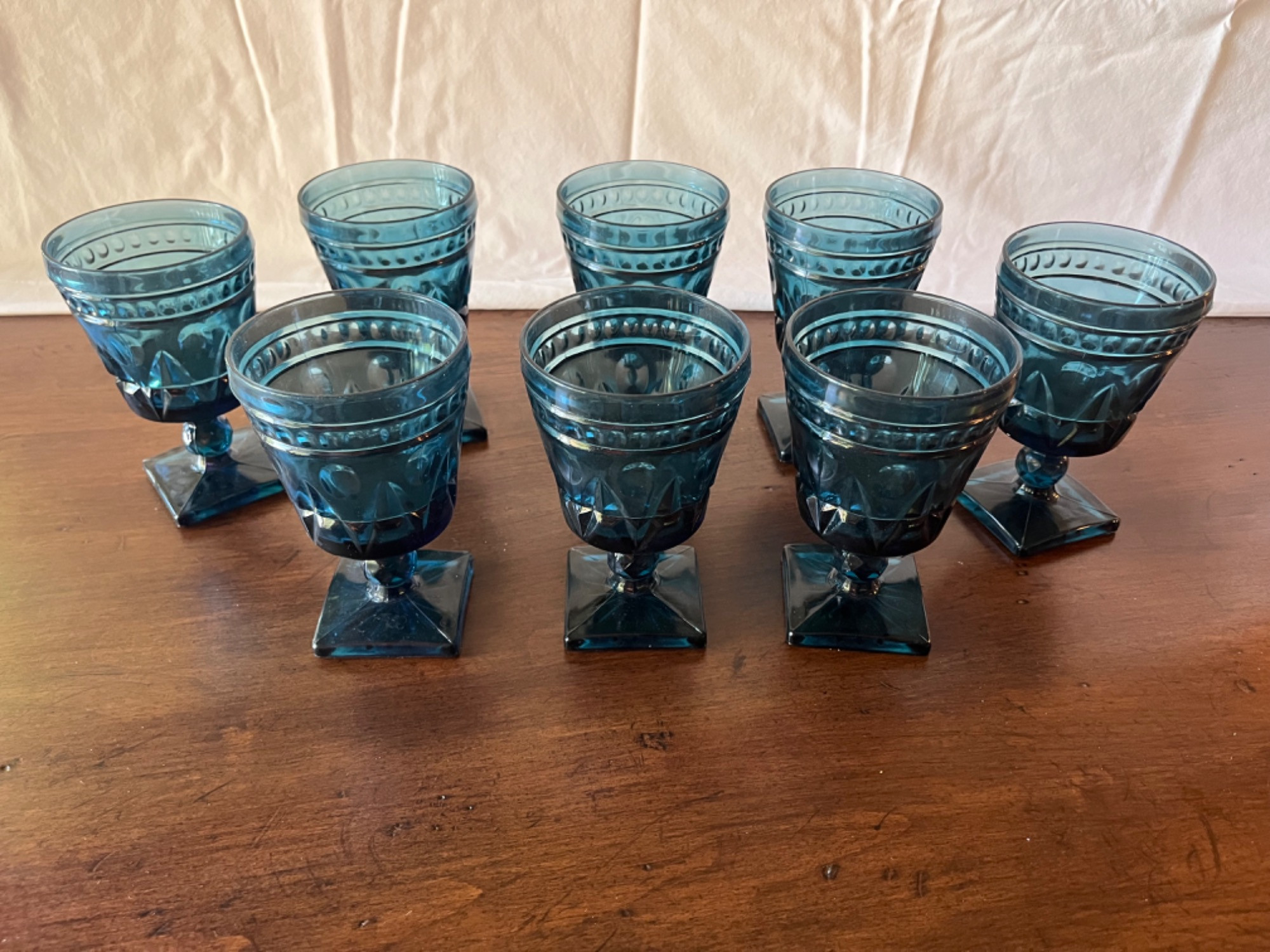 This is a set of eight blue glass goblets by Indiana Glass. Set of goblets Textured pattern on bowl and stem, square base Blue Set of eight Made of pressed blue glass. Indiana Glass Company, known for its pressed, patterned glassware, produced these goblets. The company operated from 1907 to 2002, and pieces like these were popular in American households throughout the 20th century.
