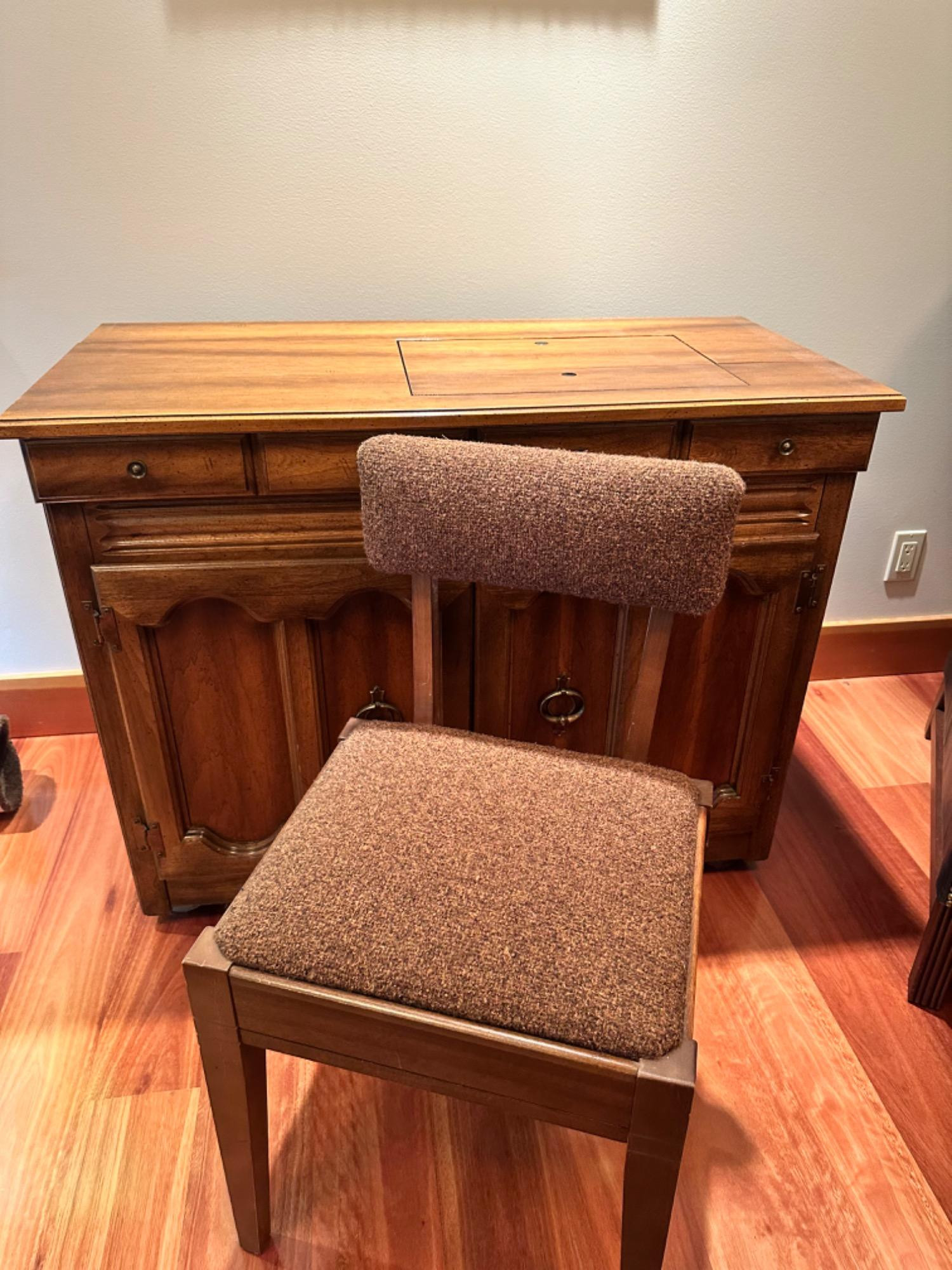 Maple Distressed Sewing Cabinet and MCM Sewing Storage Chair. Cabinet holds sewing notions and standard sewing machine. (sewing machine is not included) MCM sewing chair, seat lifts for storage. Both well cared for. Sewing cabinet measures- 32 H x 41 W x 20.5 D Chair measures- 20 x 22.5