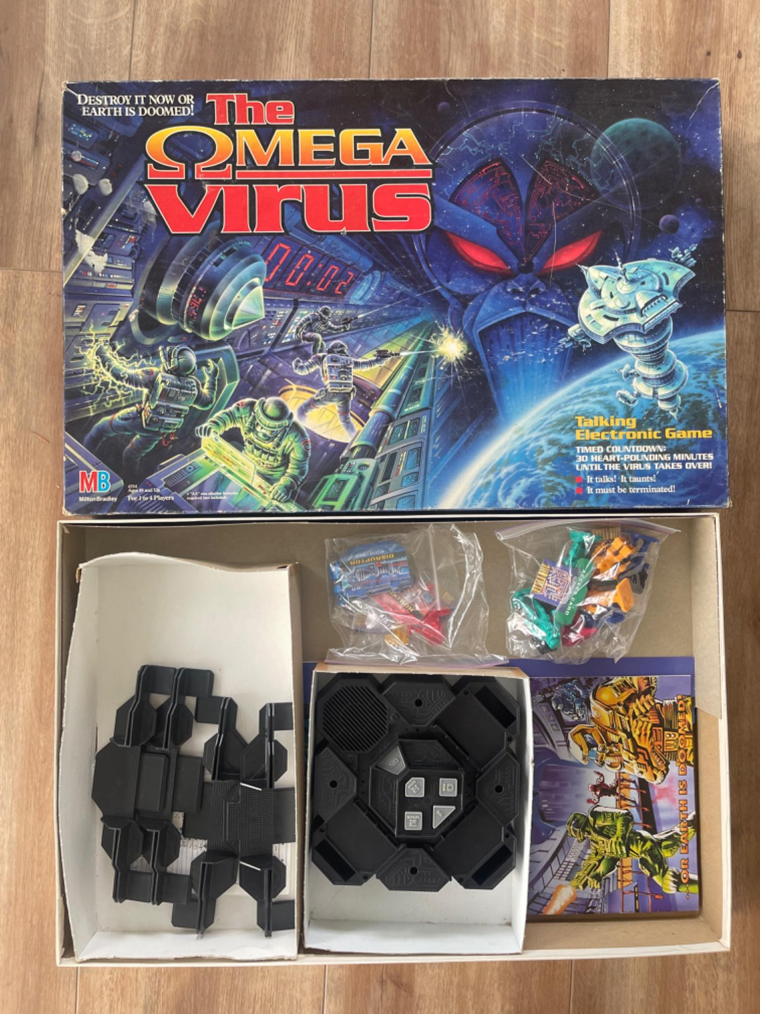 The Omega Virus Game Game has been played before and is used. However, all included contents are in great condition. Unknown completeness, but all included parts are shown in detail in photos. About game: You and the three other greatest heroes of planet earth must save the BattleSat1 space station from the evil Omega Virus. Using a computer, you explore the station collecting access cards (red, yellow, blue) and weapons (negatron, decoder, disruptor) - all of which you must find in order to locate and destroy the Omega Virus. The BattleSat pleas for help and the Virus taunts as you try to locate which room the virus is hiding.