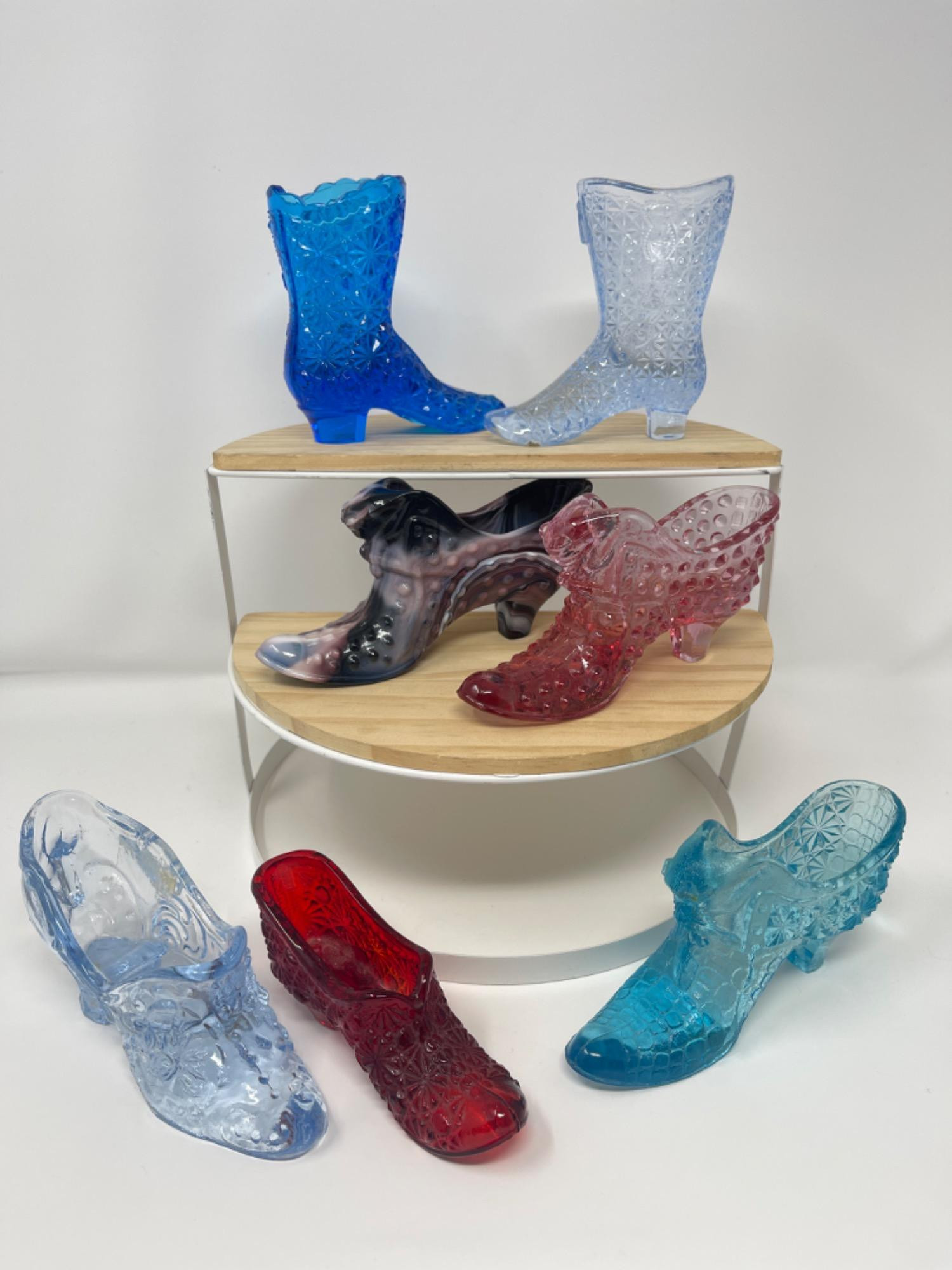 Vintage Art Glass Shoes - 1 Marked Fenton Smallest: 2" H Tallest: 4" H Some have some spots or staining. Shown in photos, but likely just need to be cleaned Display stand NOT included.