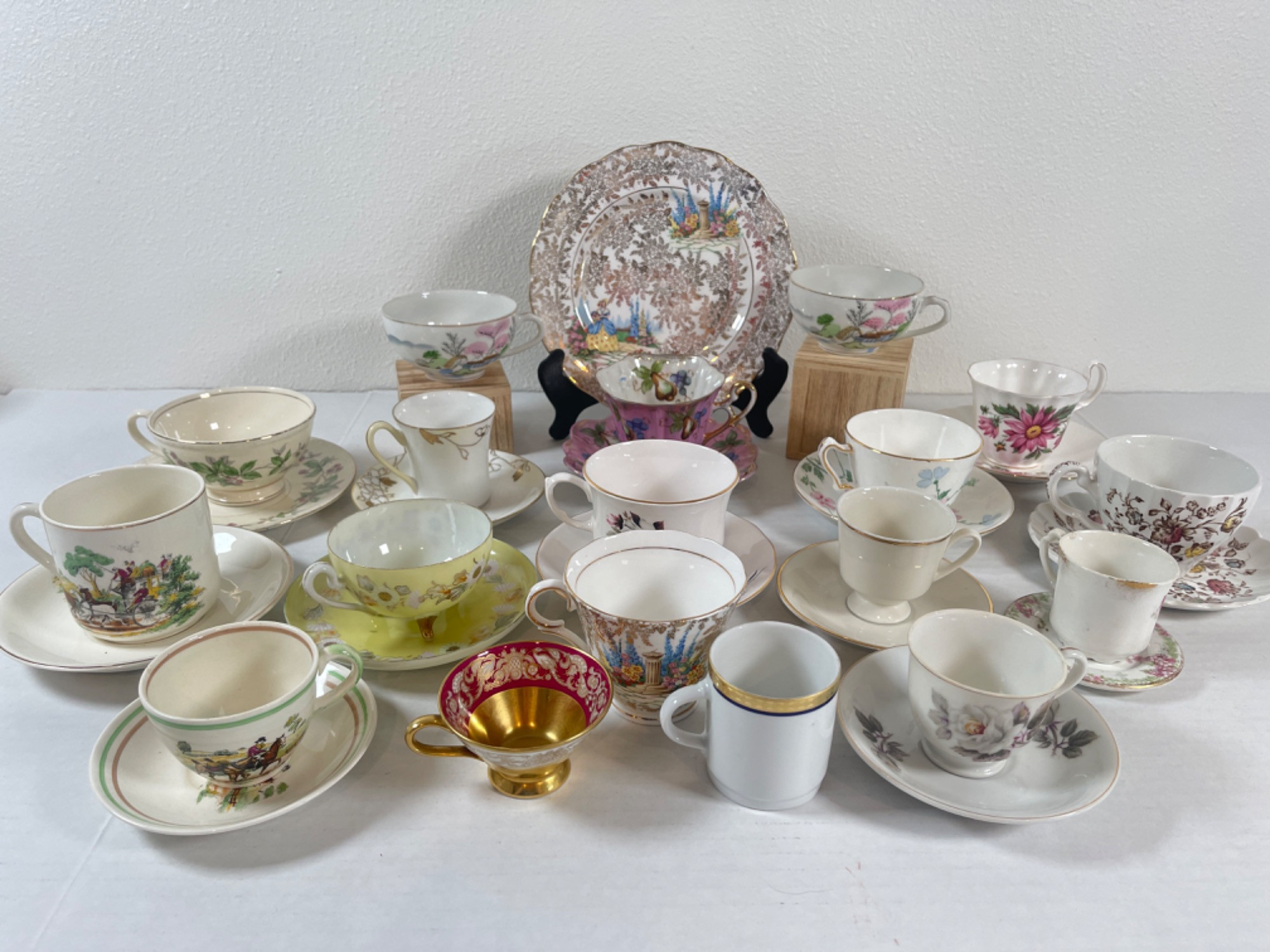 Vintage Tea Cups Including (2) Japanese Lithophane “Geisha Girl” Many have staining and scratching. Please see photos for proper representation of quality. Widest plate: 8" W Smallest plate: 3.25" W Shortest teacup: 1.5" H Tallest: 2.75" H Display stands NOT included.