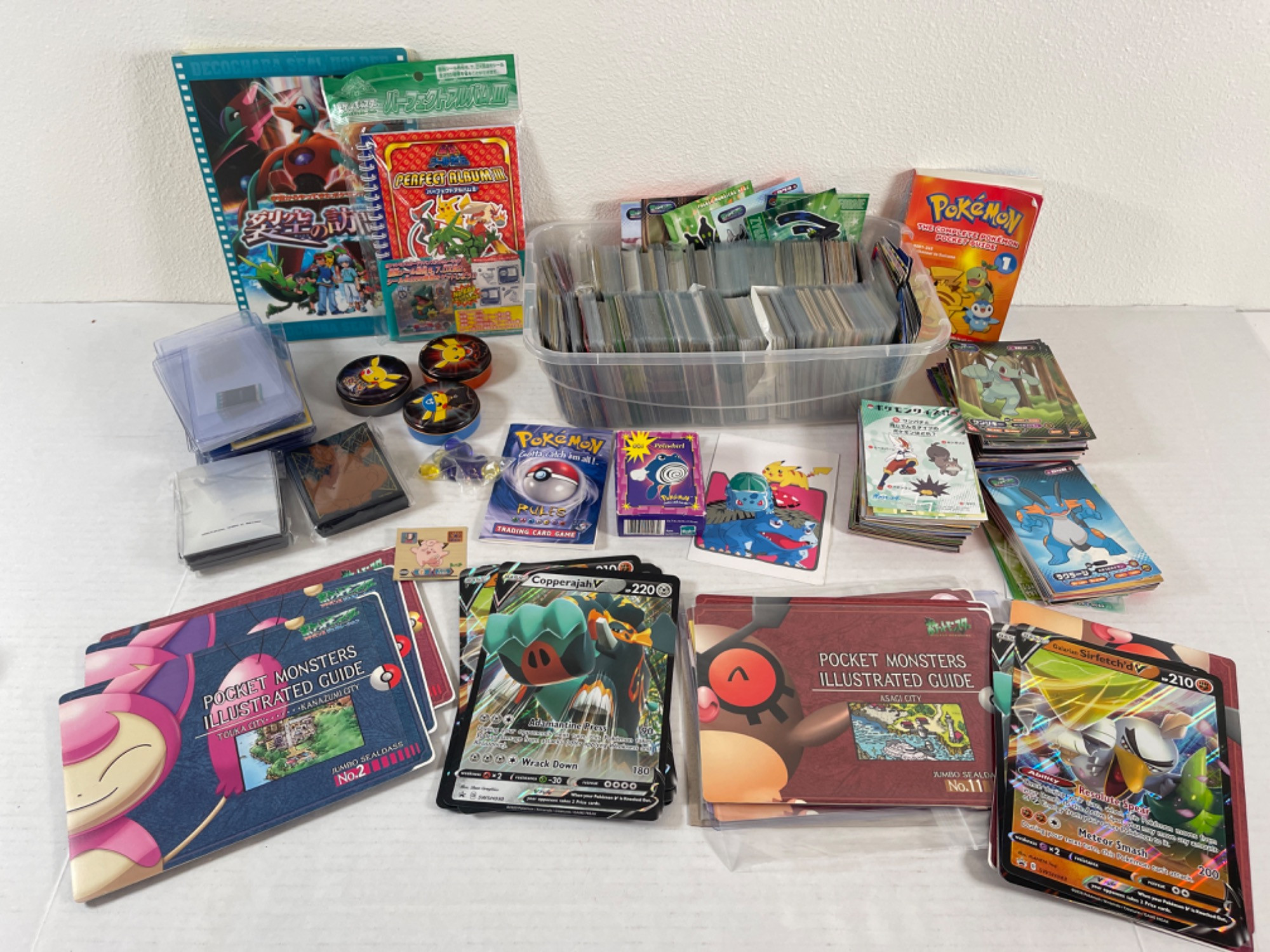 Pokemon and Pocket Monster Cards & More! Binder is 90% full Not all cards included are shown in detail. More to find! Bin Dimensions: 12” W