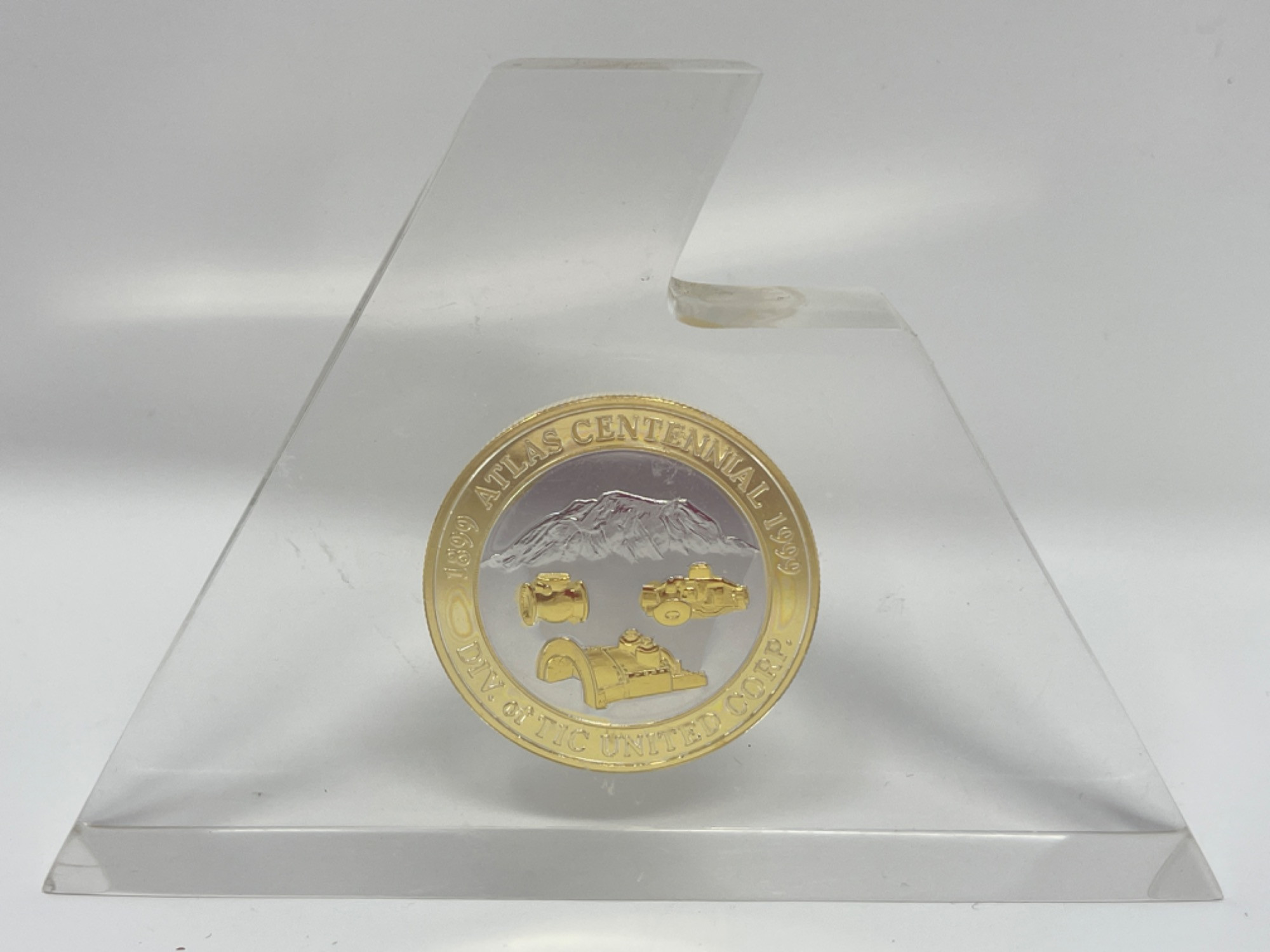 Atlas Foundry & Machine Company Centennial Coin Clear display has scratches and scuffs.