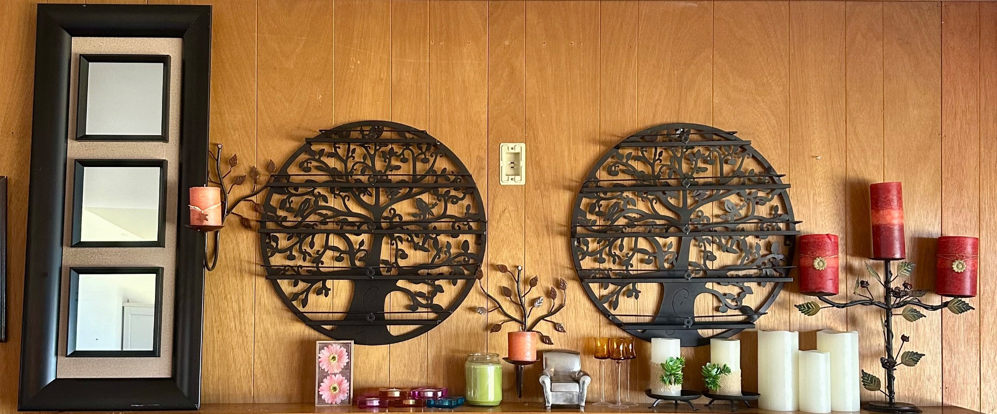 Assortment of home decor and candles with wall fixture displays & metal chair bookends