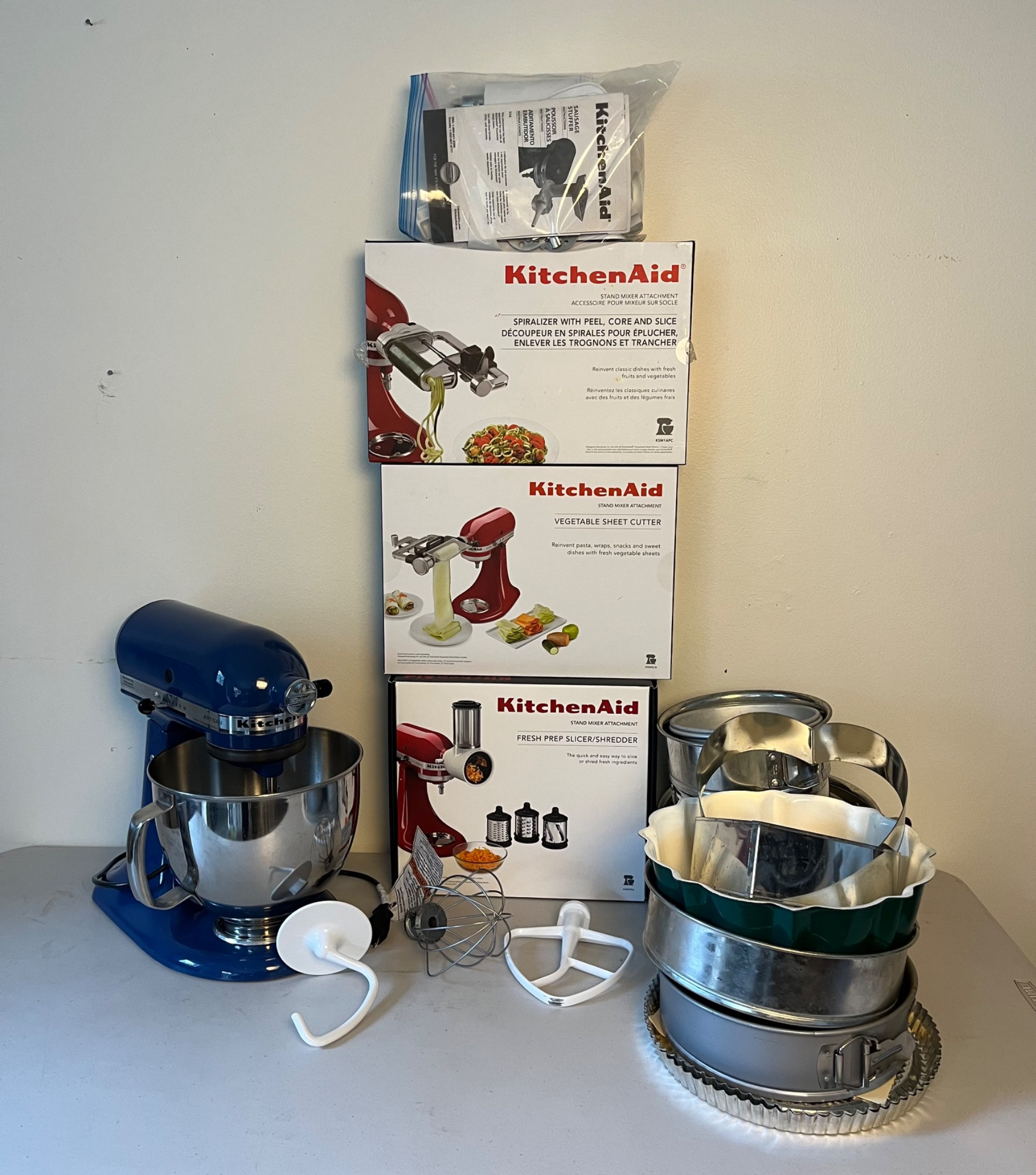 KitchenAid 5 Qt. Artisan Stand Mixer/Attachments & Baking Pans KitchenAid Sausage Stuffer Bundt pan, Pampered Chef flan pans, multiple springform pans and other pans & baking items