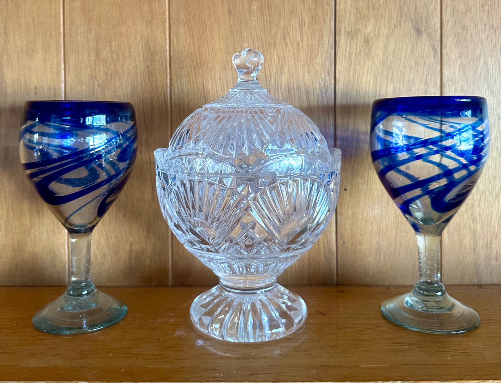 Hand Blown Glass / Lidded Crystal Candy Dish Lidded Crystal Candy Dish - 3 1/2" x 6" x 9 3/4" 2 Hand Blown Wine Glasses - 3” x 3 1/2" x 7”
