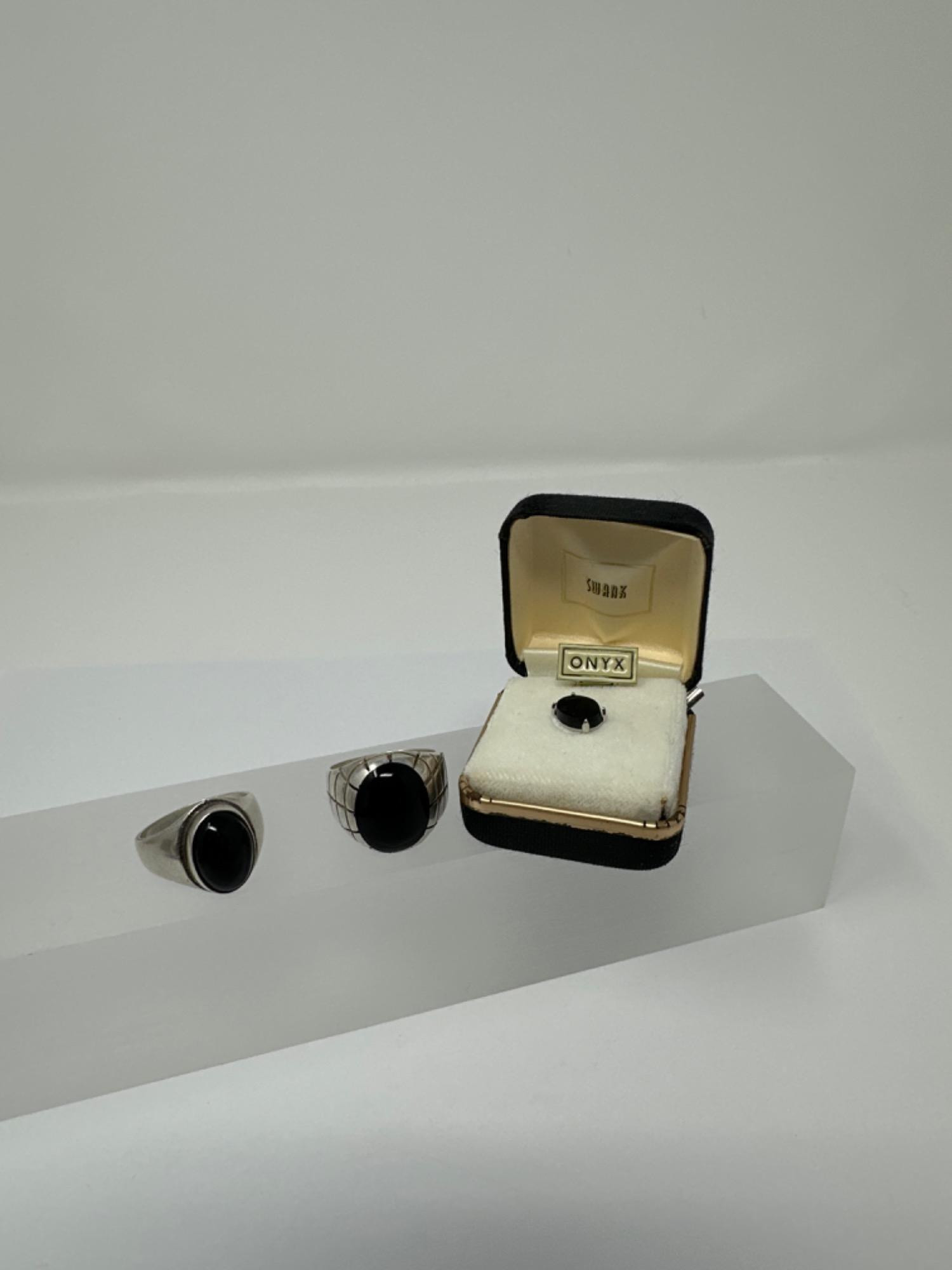 Two Sterling Onyx Rings and Sterling Onyx Tie Tack 10.5 and 11 size ring Onyx tie tac in sterling setting.