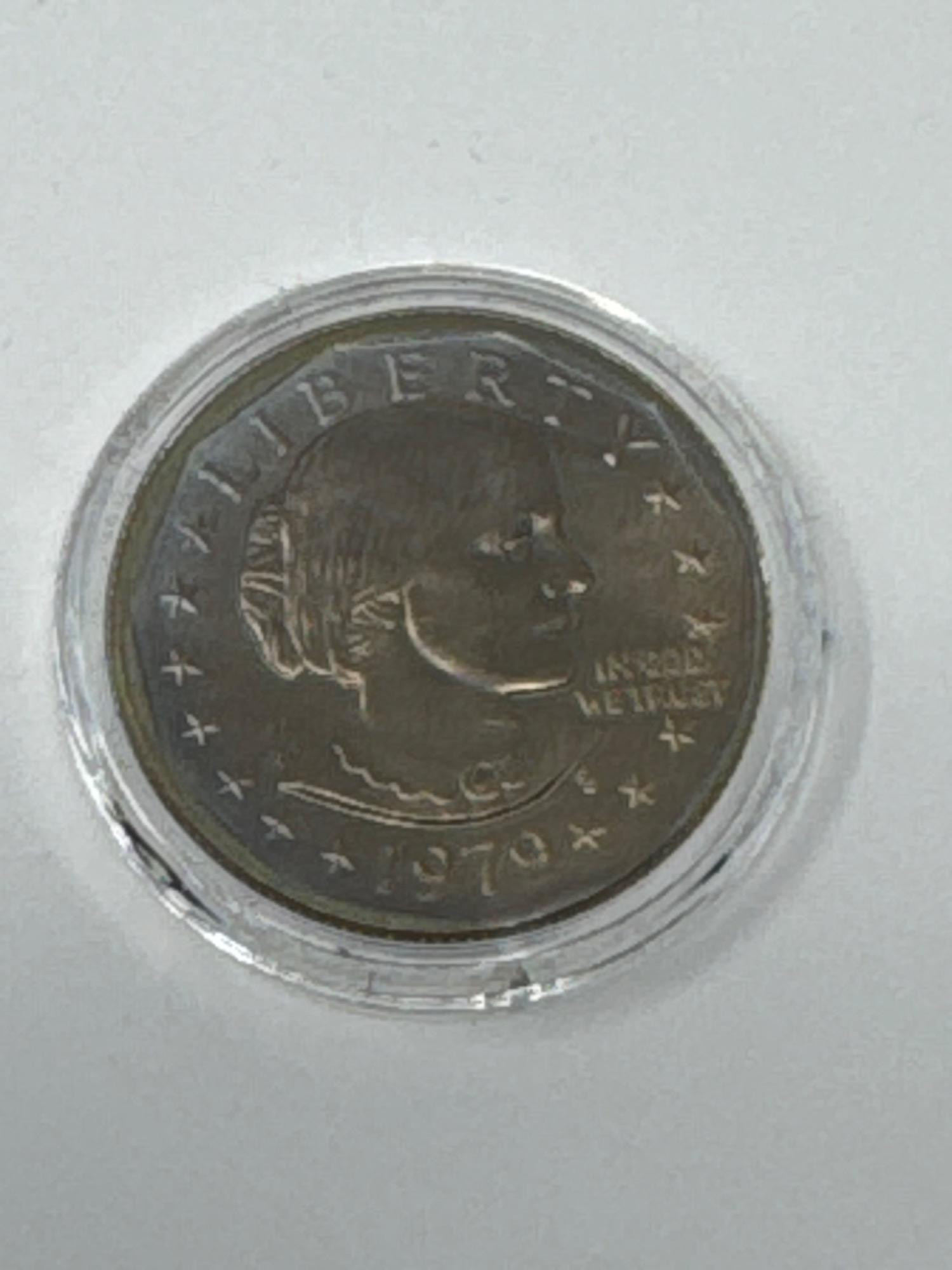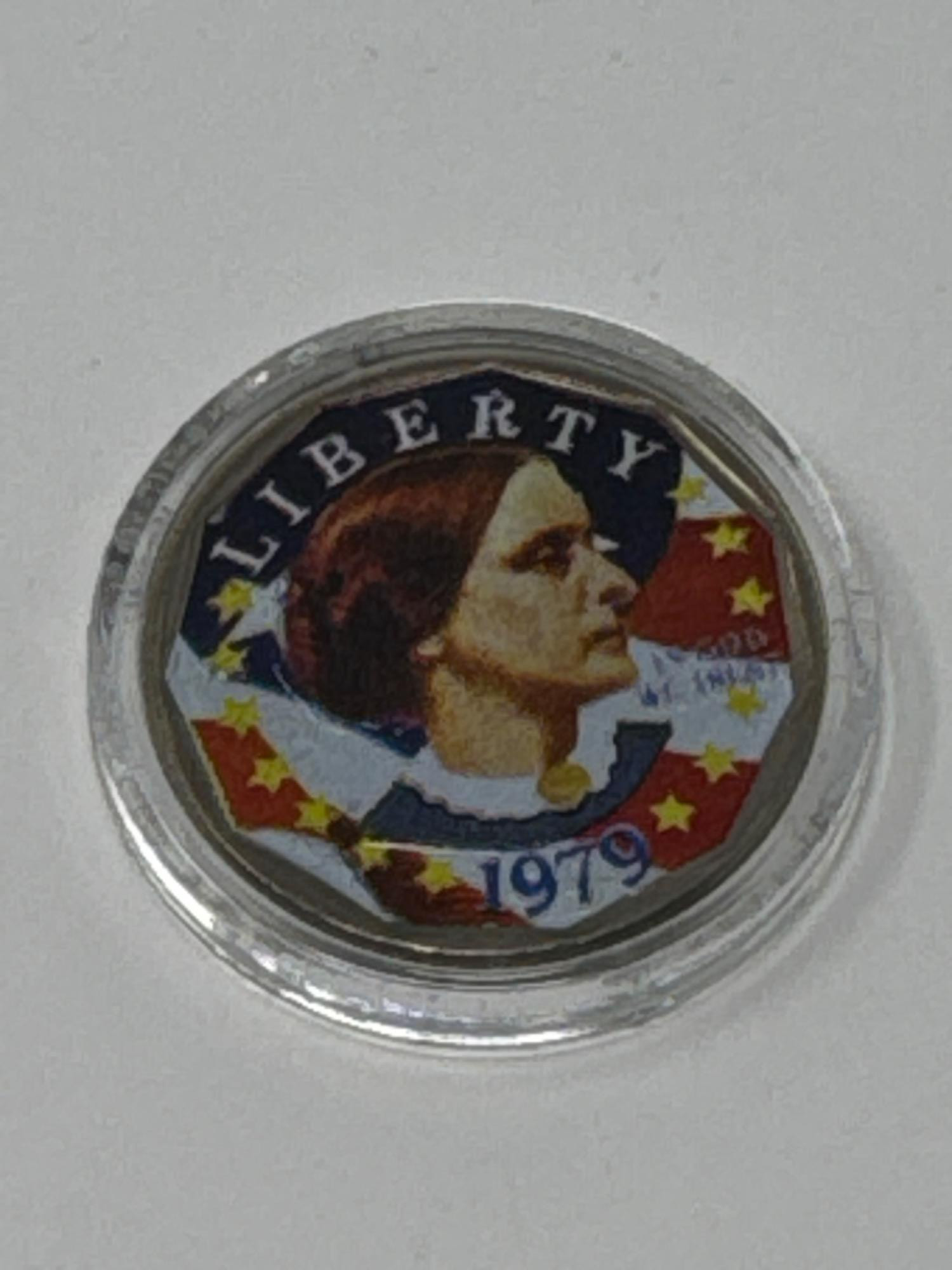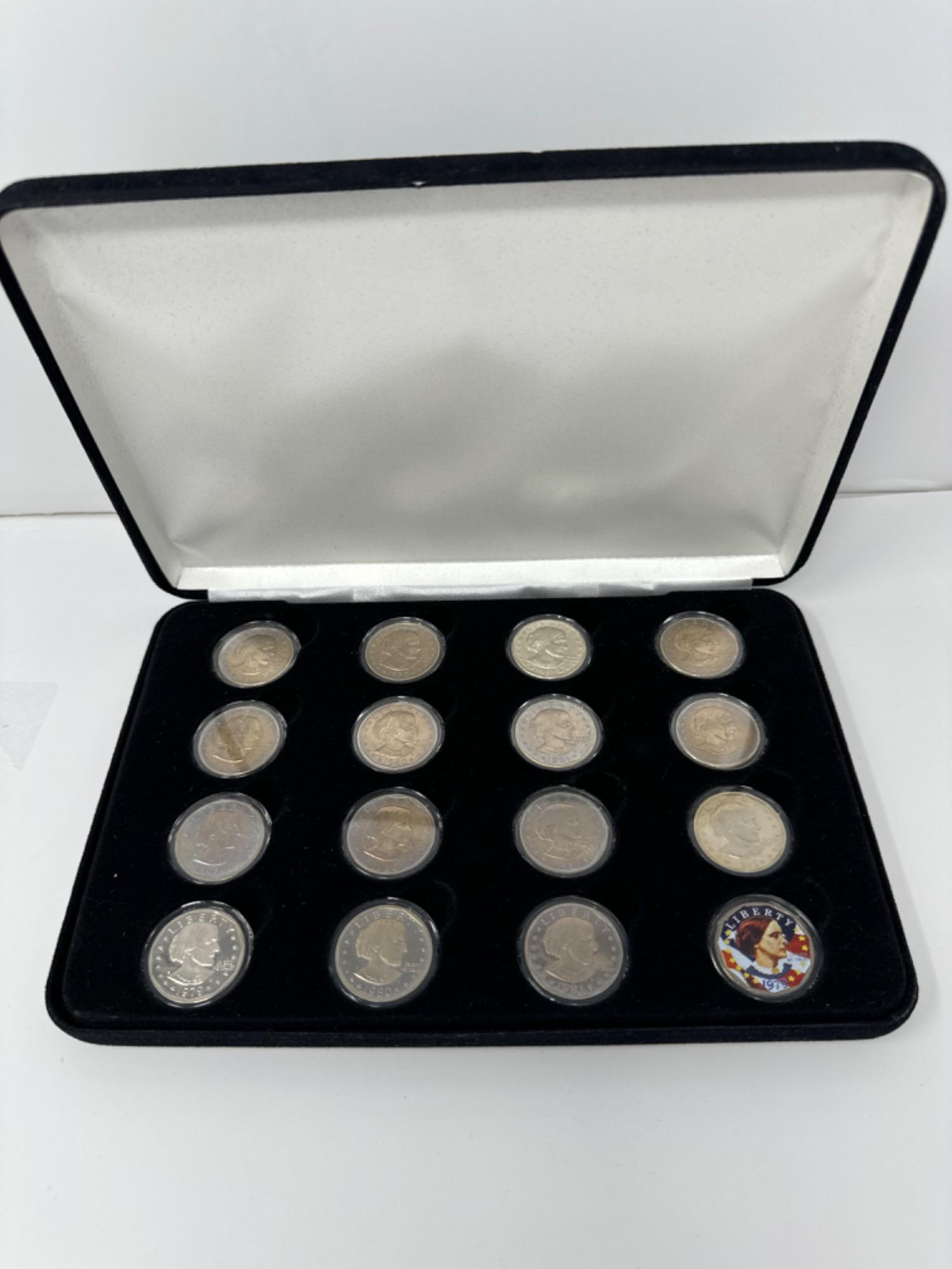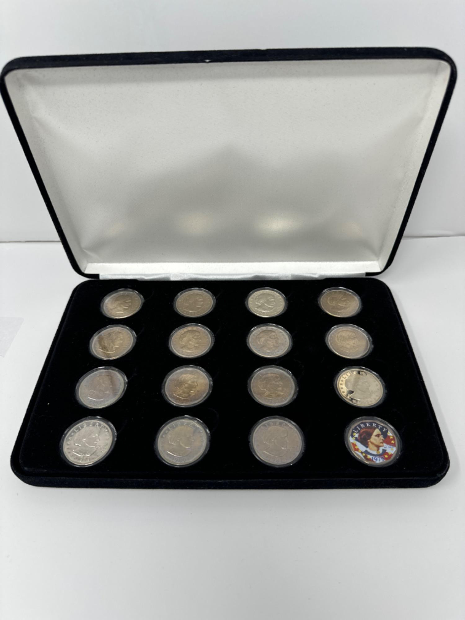 16 total $1 Susan B Anthony Coins 5 - 1979 including 1 coin of the colors of our US flag 4 —1980 4 — 1981 3 — 1999 Case is 9” X 6”