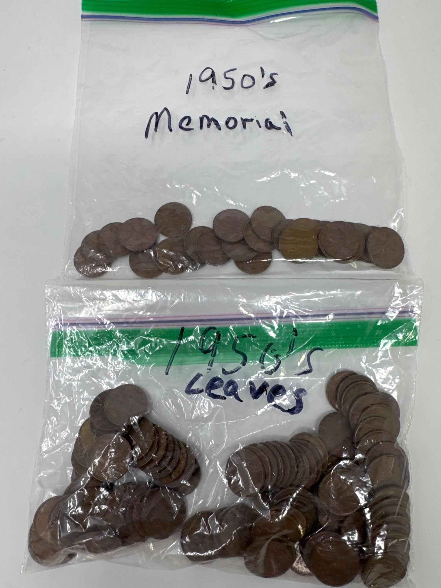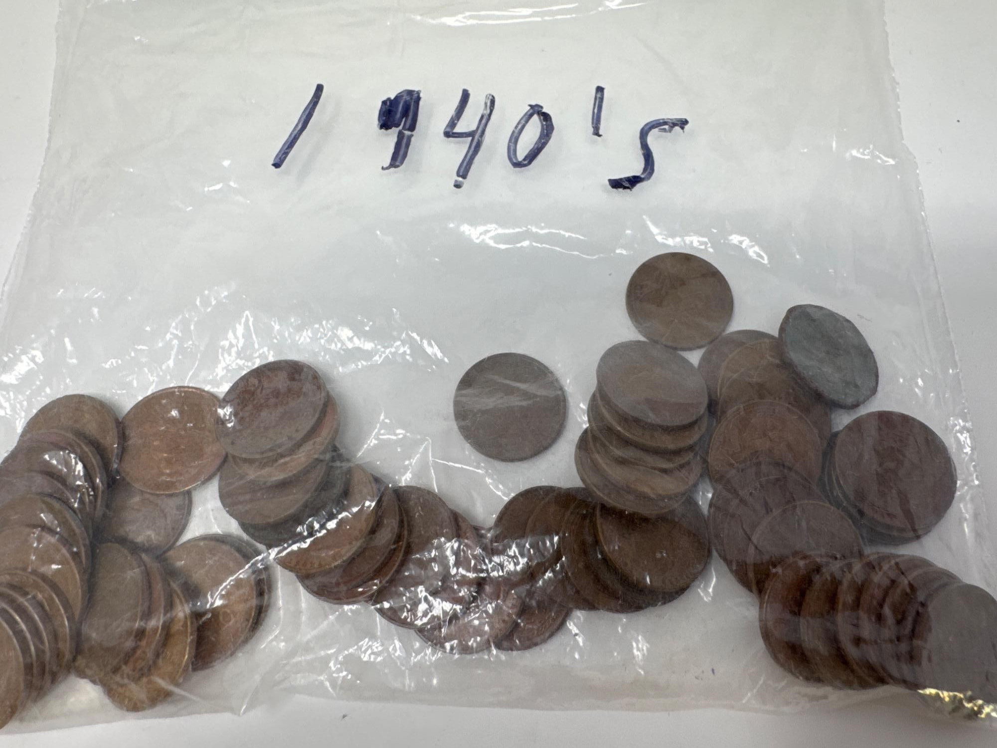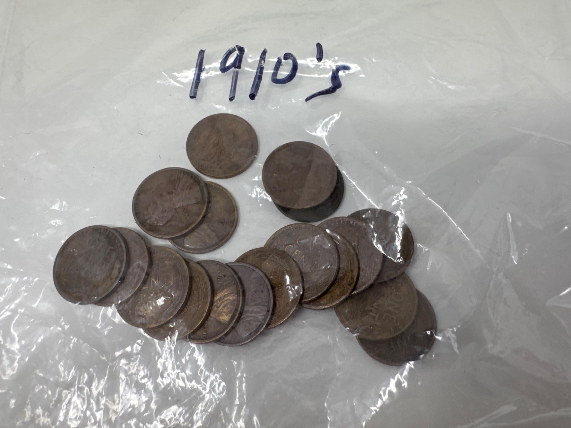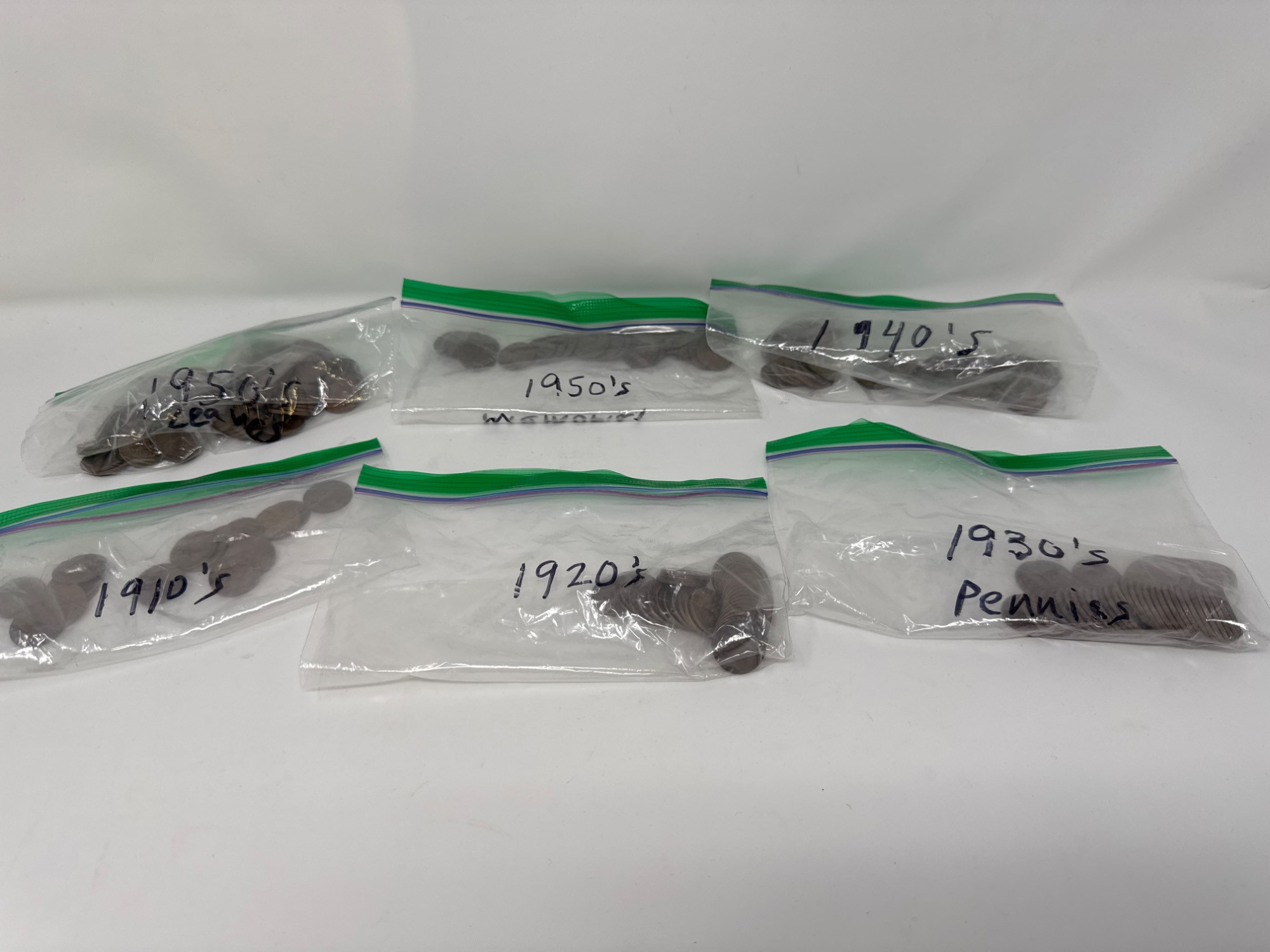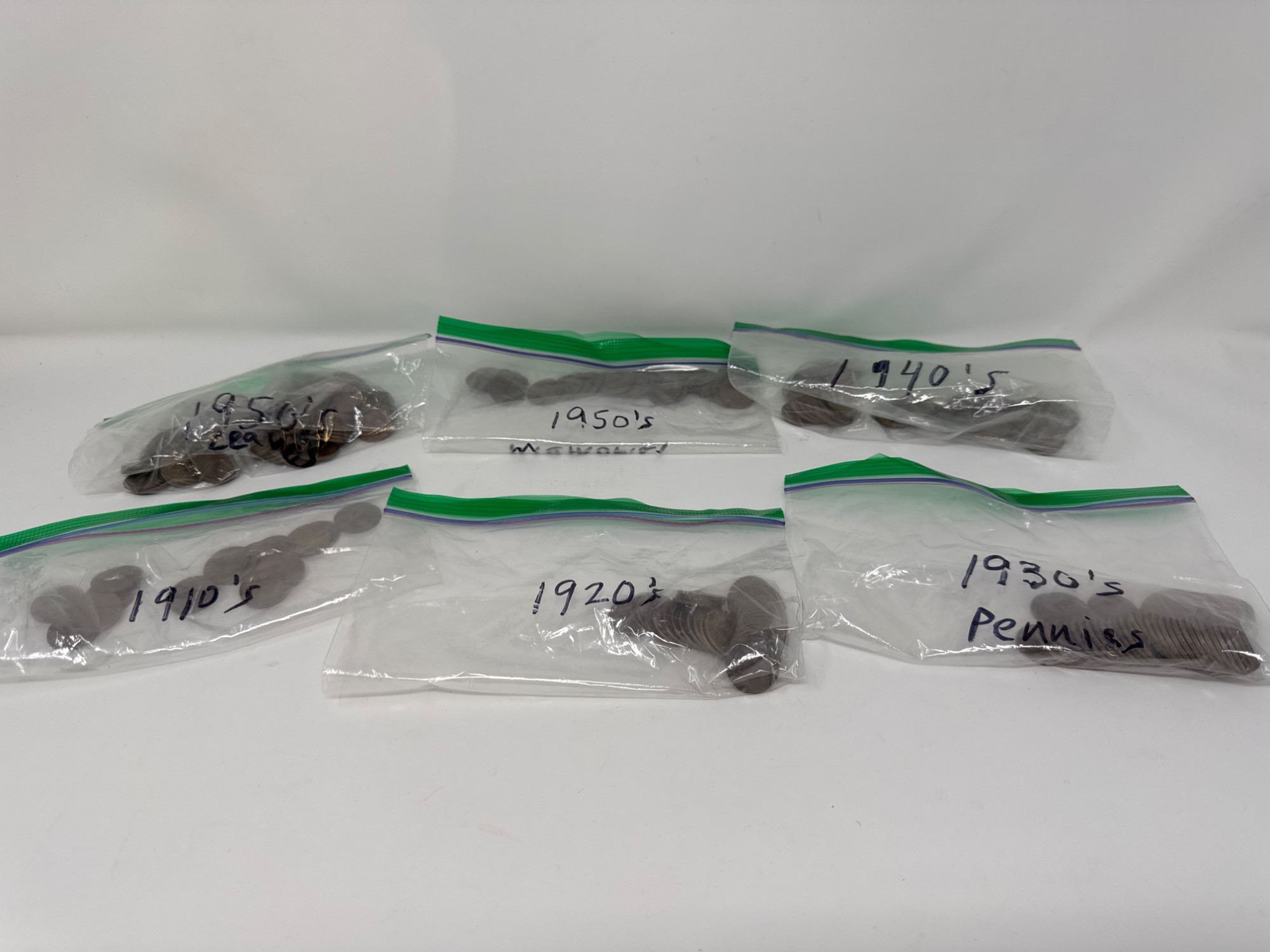 1 Baggie of pennies of the following decades: 1910s , 1920s, 1930s, 1940s and 1950s.