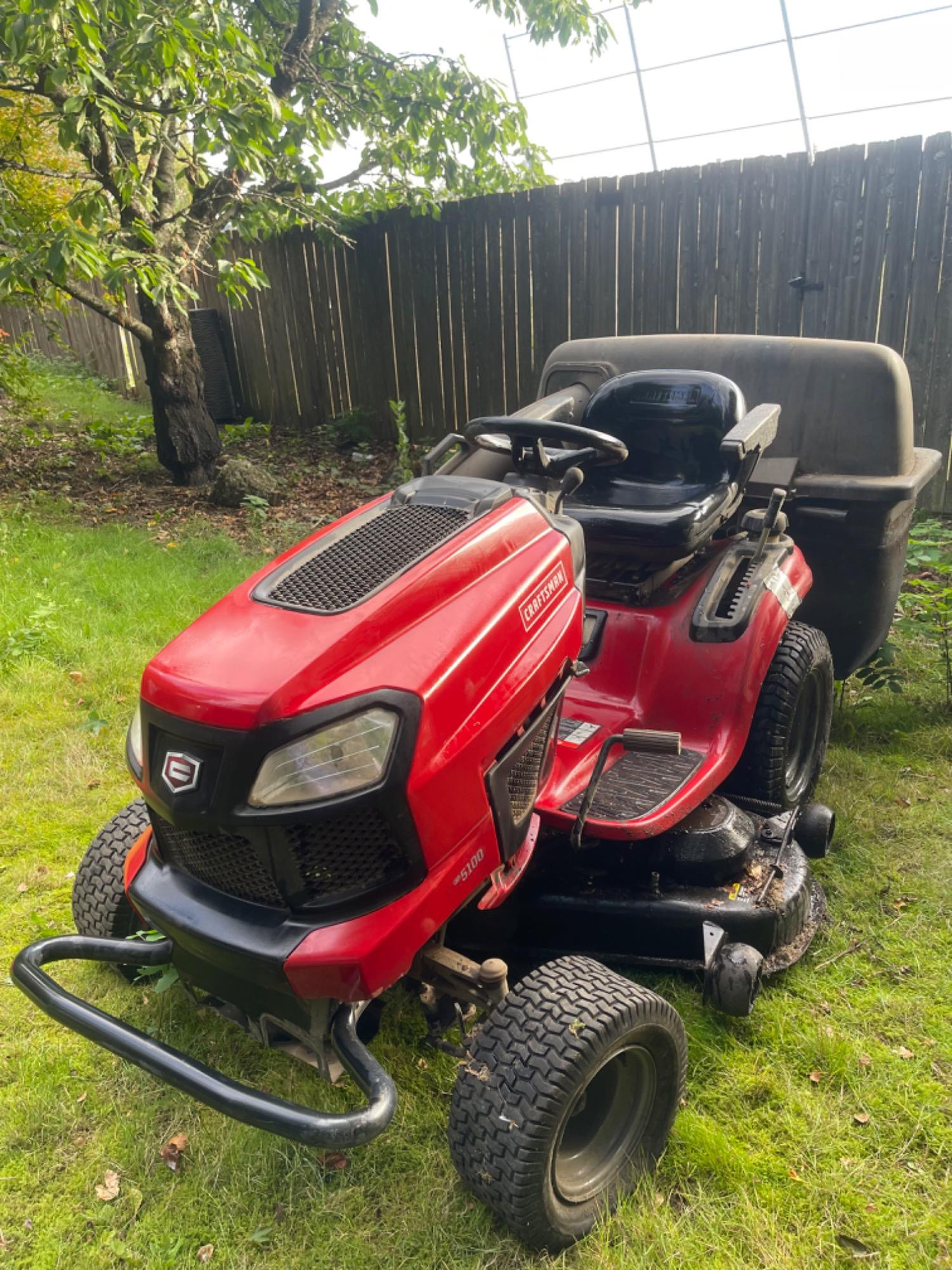 Red Craftsman G5100 Riding Lawn Mower, Aerator & Trailer Needs cleaning, but has been kept in good condition. Both mower and aerator have been stored inside of a shed. Trailer has a FLAT TIRE. This will NOT be fixed prior to pickups and will be on responsibility of bidder to fix. Mower will be checked prior to closing of auction to ensure it is in good working condition.
