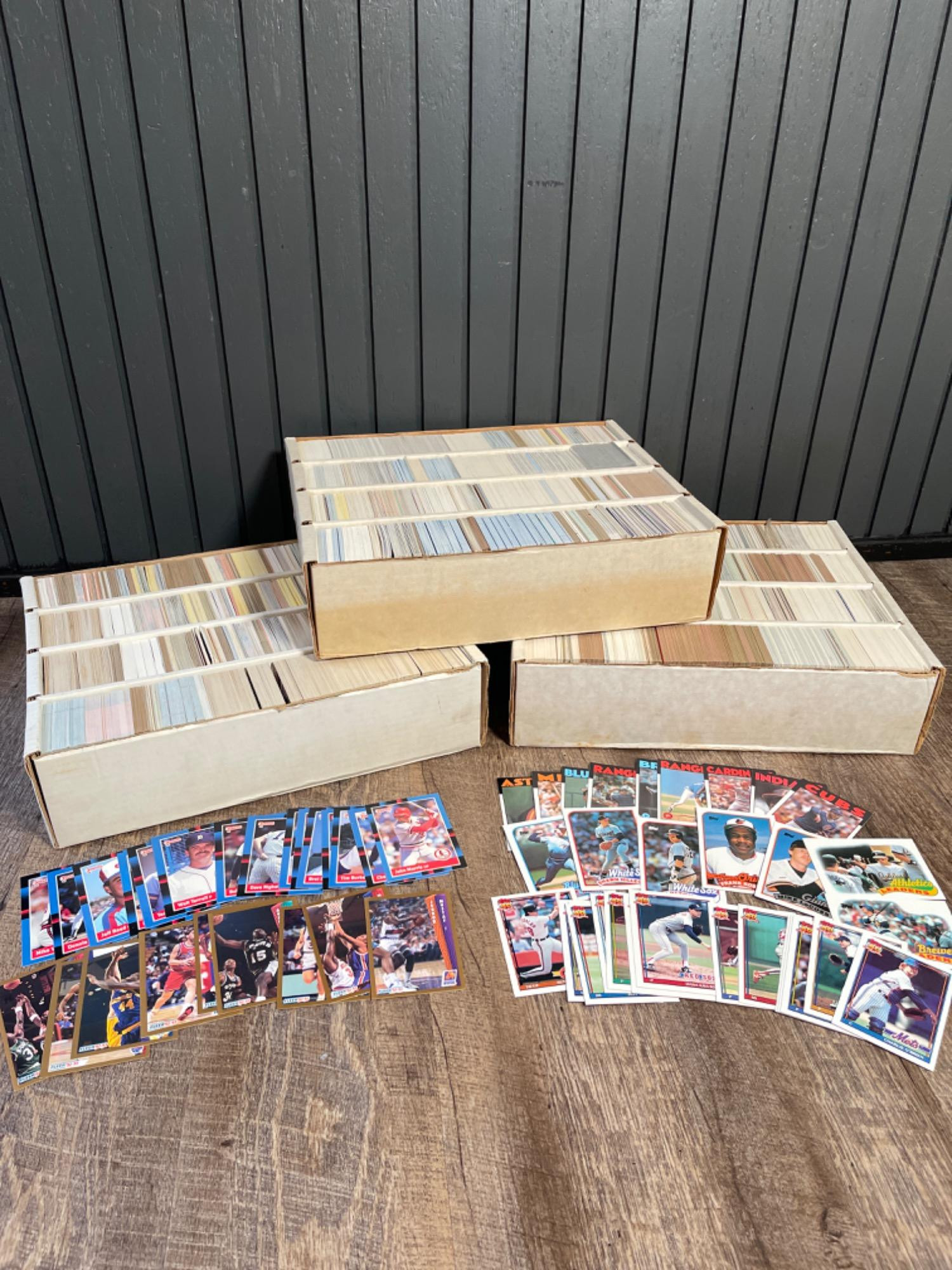 All Sports Cards - 80s & 90s NOT ALL CARDS INCLUDED SHOWN IN DETAIL. Displayed cards are just a "taste" of what is inside each box. So much more! Cards are in good condition. Have been kept in boxes, but not in sleeves so expect some imperfections. Boxes are all 12" x 14.5"