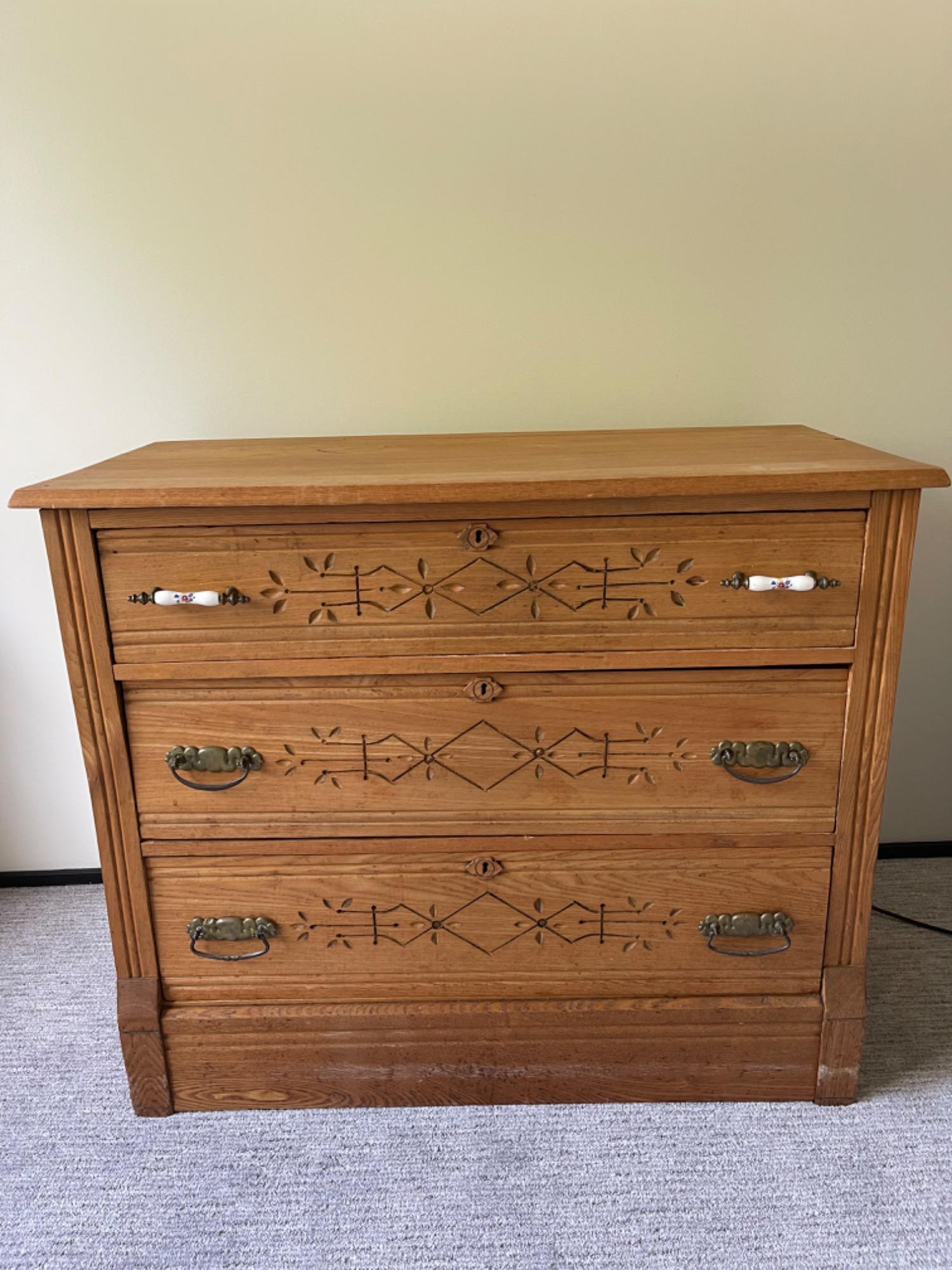 Beautiful Eastlake Carved Solid Wood Dresser Multiple scuffs and scratches to wood, but holding together very well.
