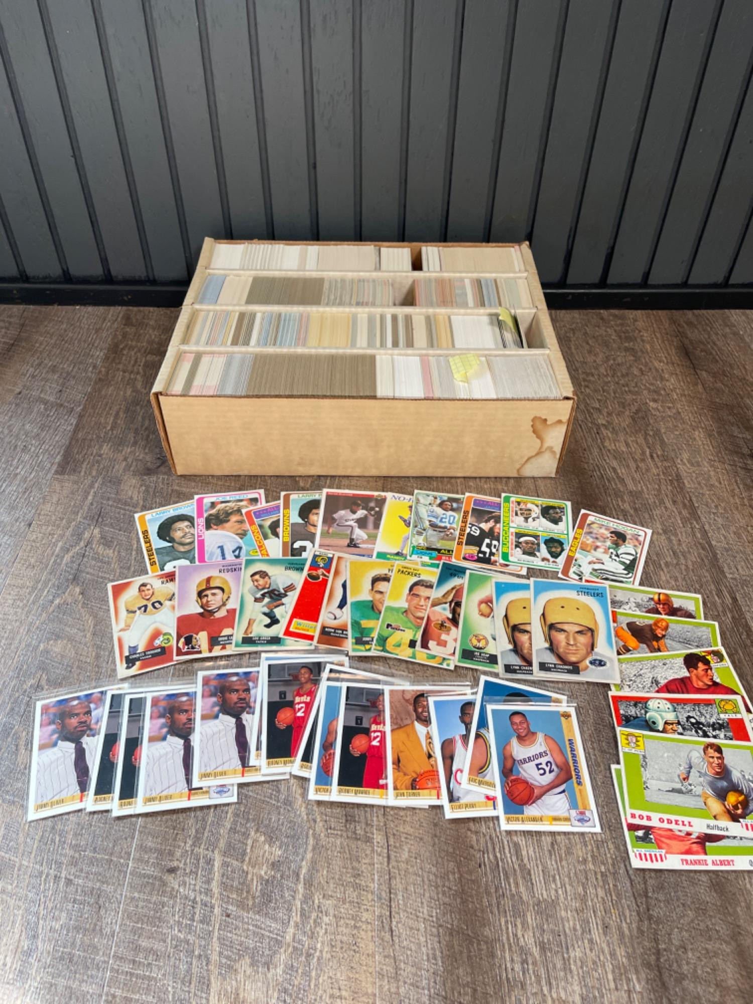 50s, 70s, 80s & 90s Sports Cards! NOT ALL CARDS INCLUDED SHOWN IN DETAIL. Displayed cards are just a "taste" of what is inside each box. So much more! Cards are in good condition. Have been kept in boxes, but not in sleeves so expect some imperfections. Box is 12" x 14.5"