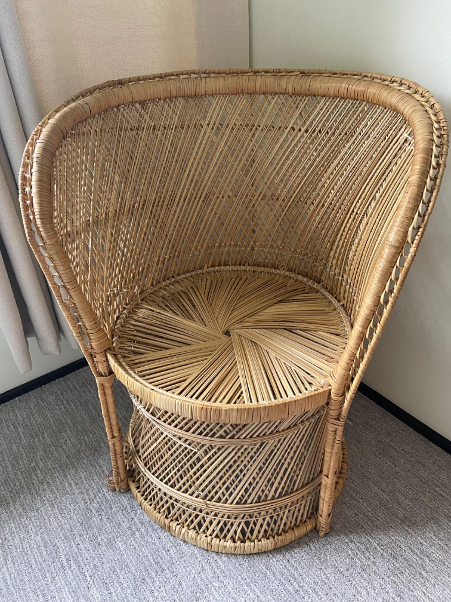 Round Wicker Chair Fraying of wicker in multiple places, but chair is still sturdy. Please see photos. Cushion is included, but is not original to the chair.