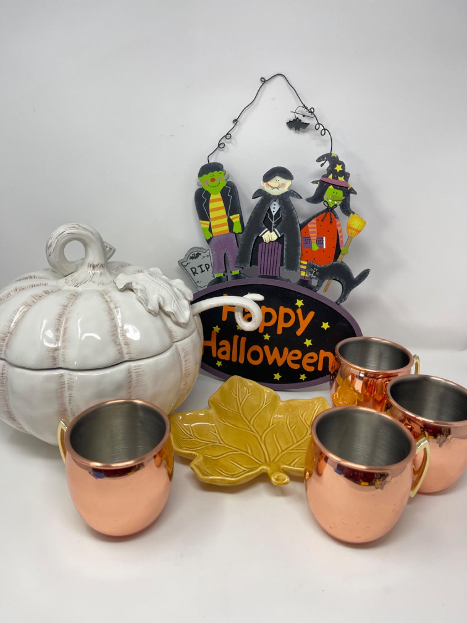 Fall Decor And Kitchen Items! Mikasa Pumpkin Bowl has some cracking, and copper mugs have some tarnishing and scratching. Good used condition. Shortest: 1" H Tallest: 16"