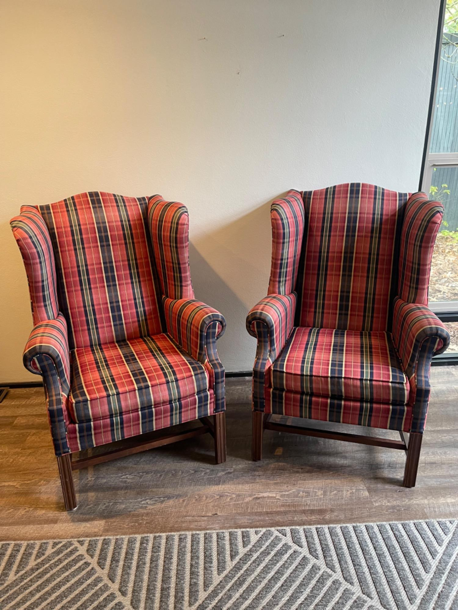 Two Plaid Wingback Chairs Both have multiple snags and scuffs. Not noticeable unless close up. Good used condition.