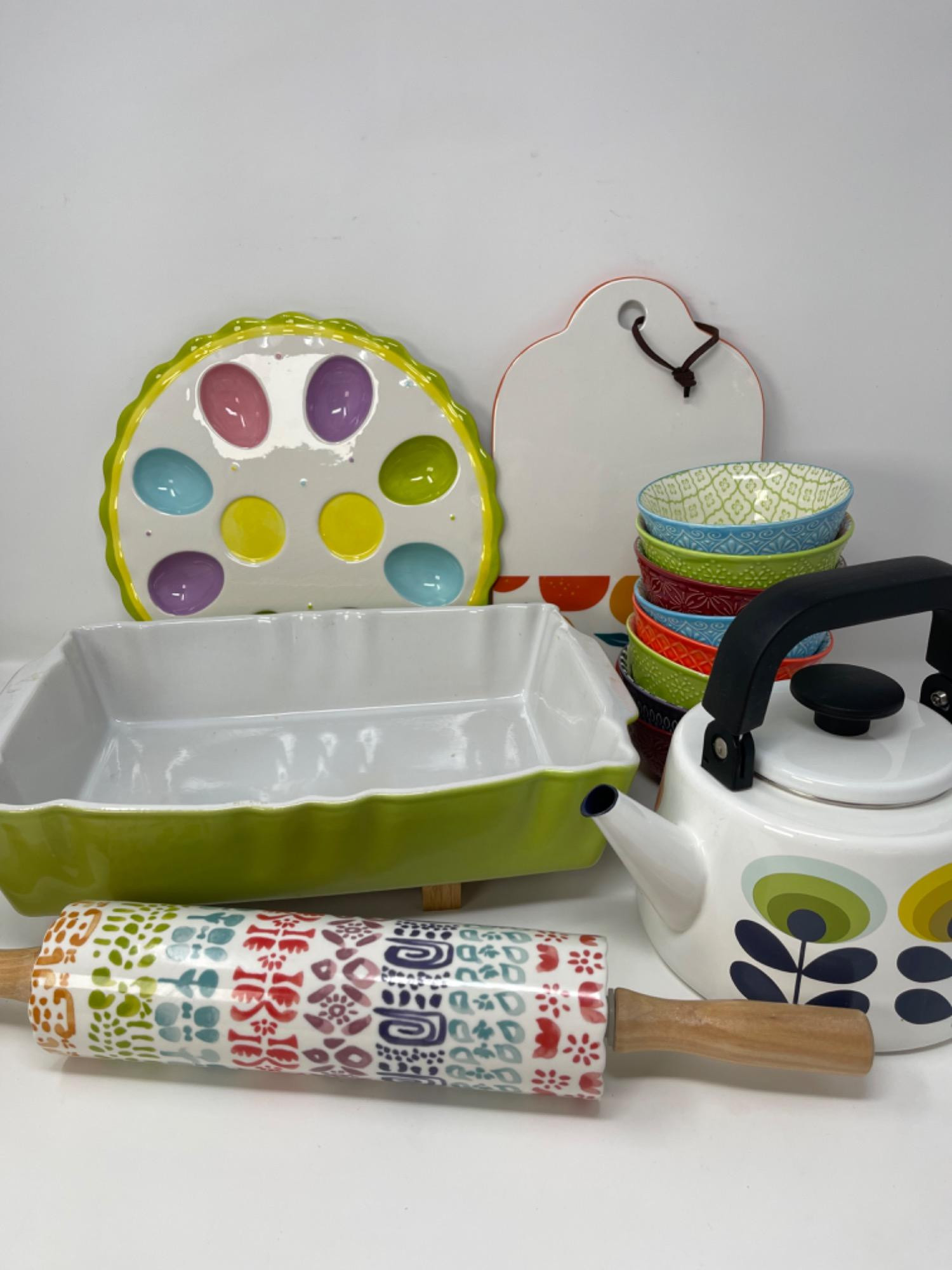 Spring Style Kitchen Items and Decor All are good used condition. All have some scratches from use, but have been well cared for. Some cracking in design to egg dish. Widest: 18" W Smallest: 4.75" W