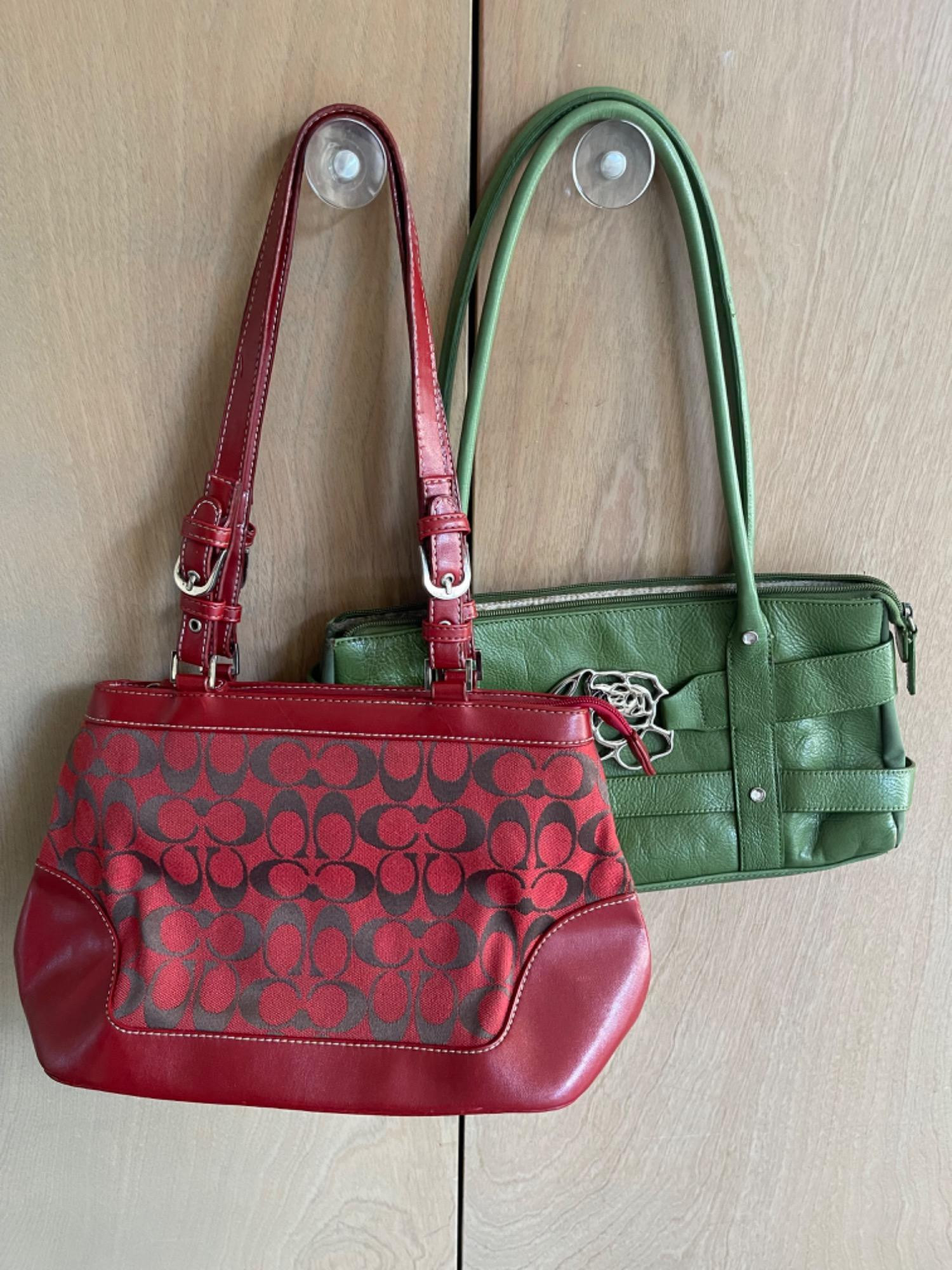 Vintage Red Coach Purse and Green Franco Sarto Good used condition, but both have minor staining and discoloration inside. Coach handle has some fraying, but holding together. Red Coach Purse: 13" W x 18" H Franco Sarto Purse: 14" W x 17" H