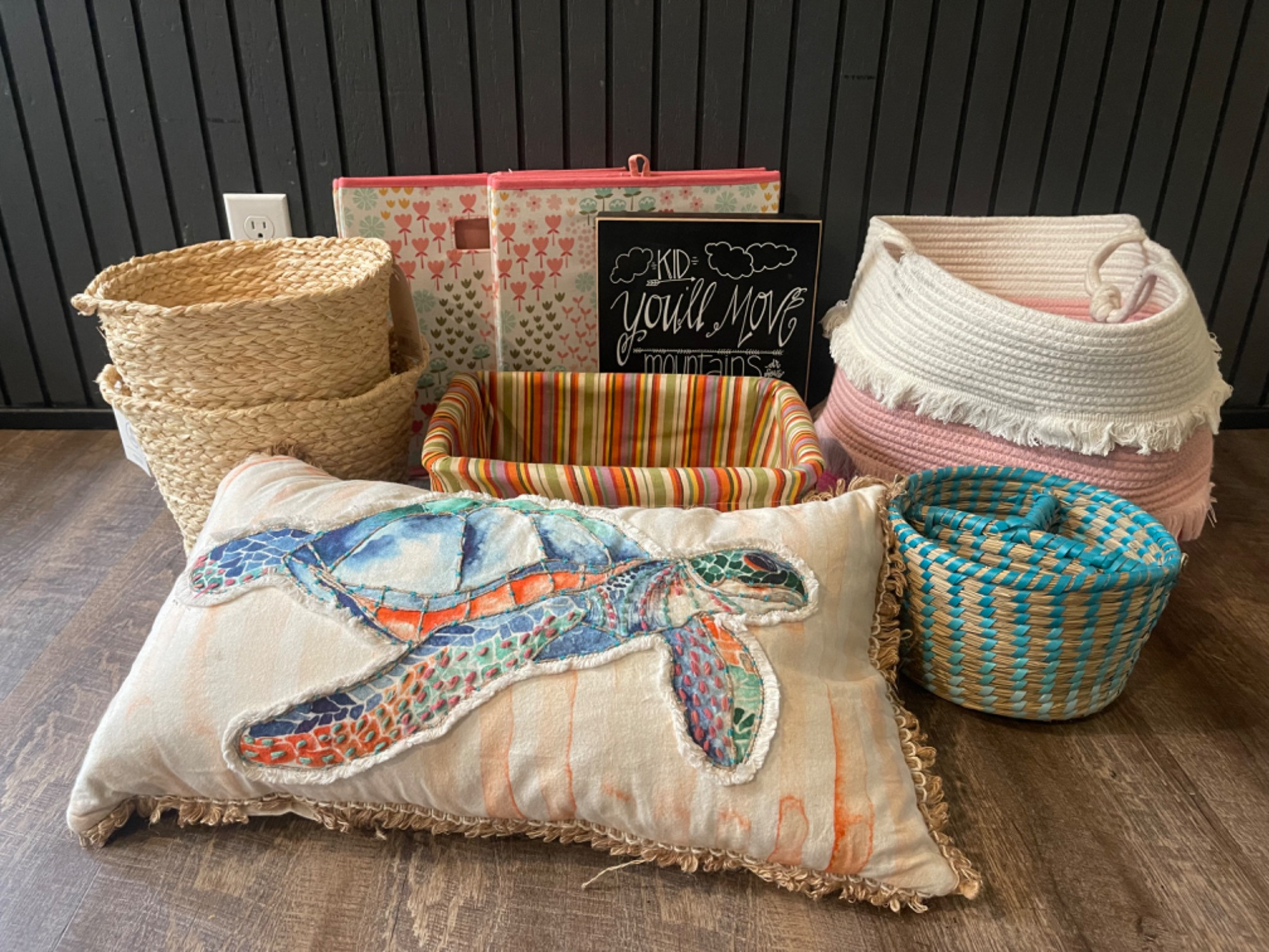 Kids Room Decor All good used condition. Some fraying on baskets. Large pink basket has a couple of stains - see photos. Tallest item: 13" H Shortest: 6" h