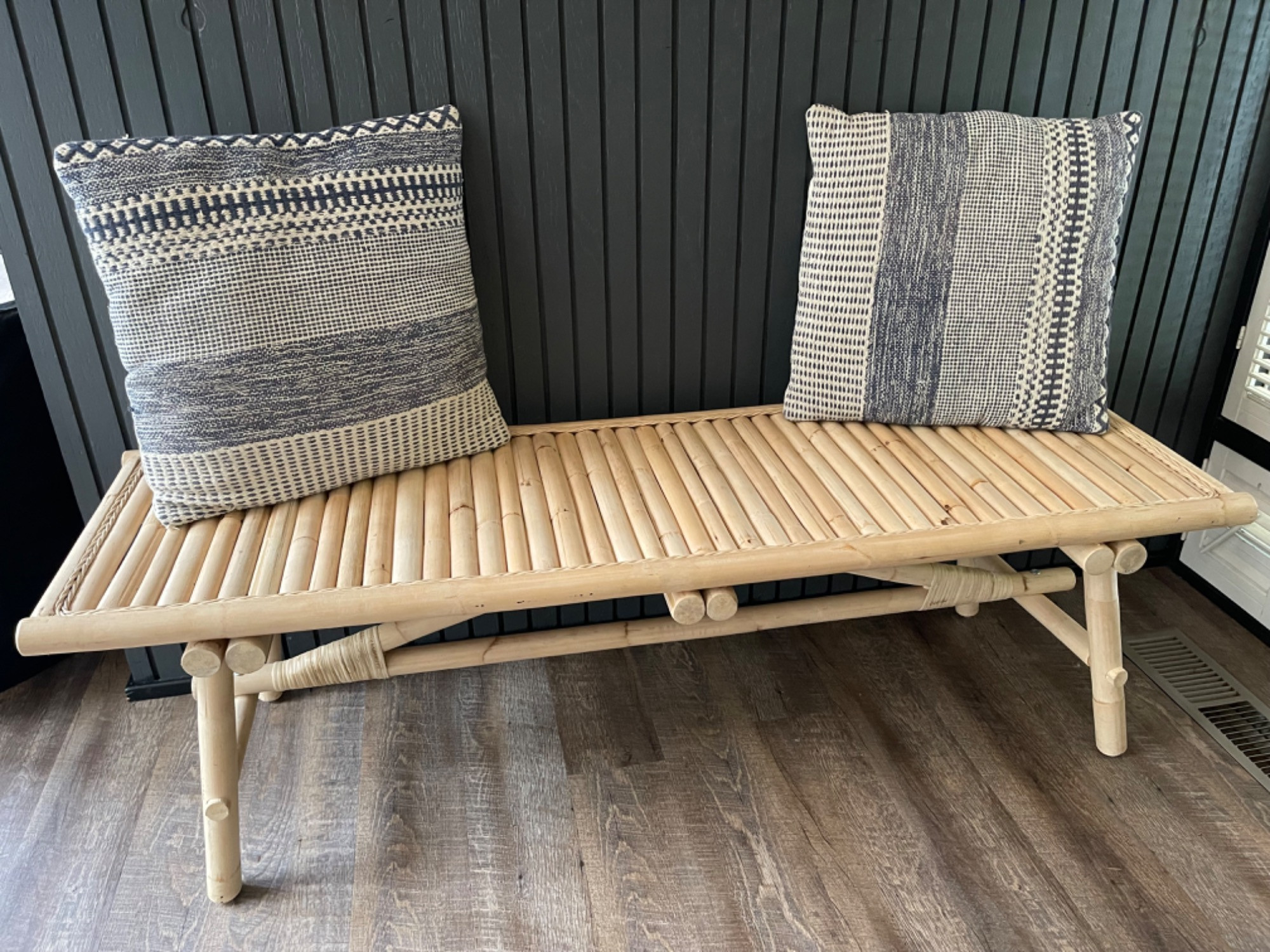 Beautiful Rattan Bench + Pillows Great condition, very small scuffs and stains which have been shown in photos.