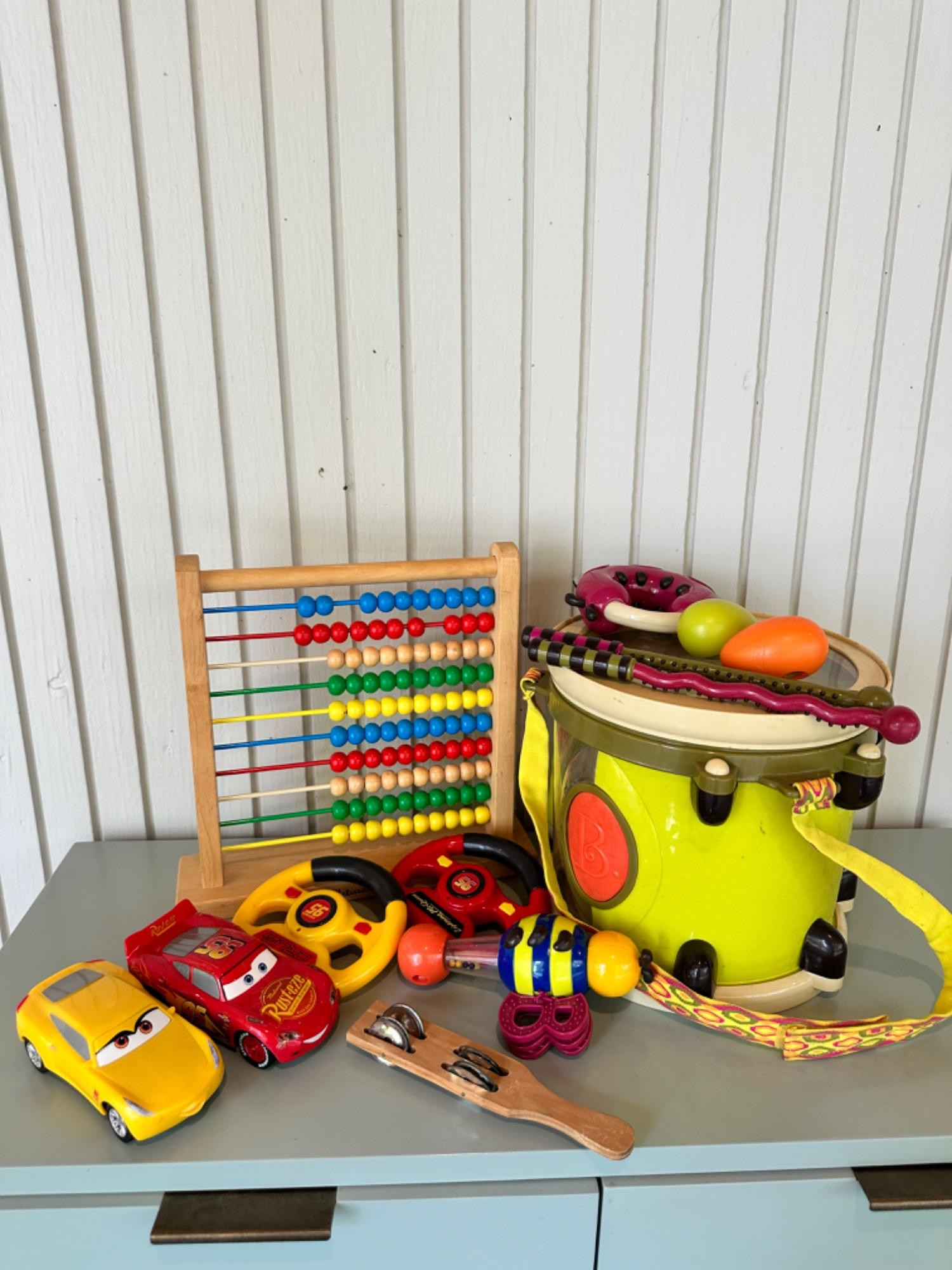 Drum with Instruments, CARS Race Remote Control Cars and Wood Abacus. All toddler toys. Drum comes with hand held instruments, all fit in middle of drum. Disney CARS remote control cars, battery operated. Needs new batteries. Wood Abacus in good condition.