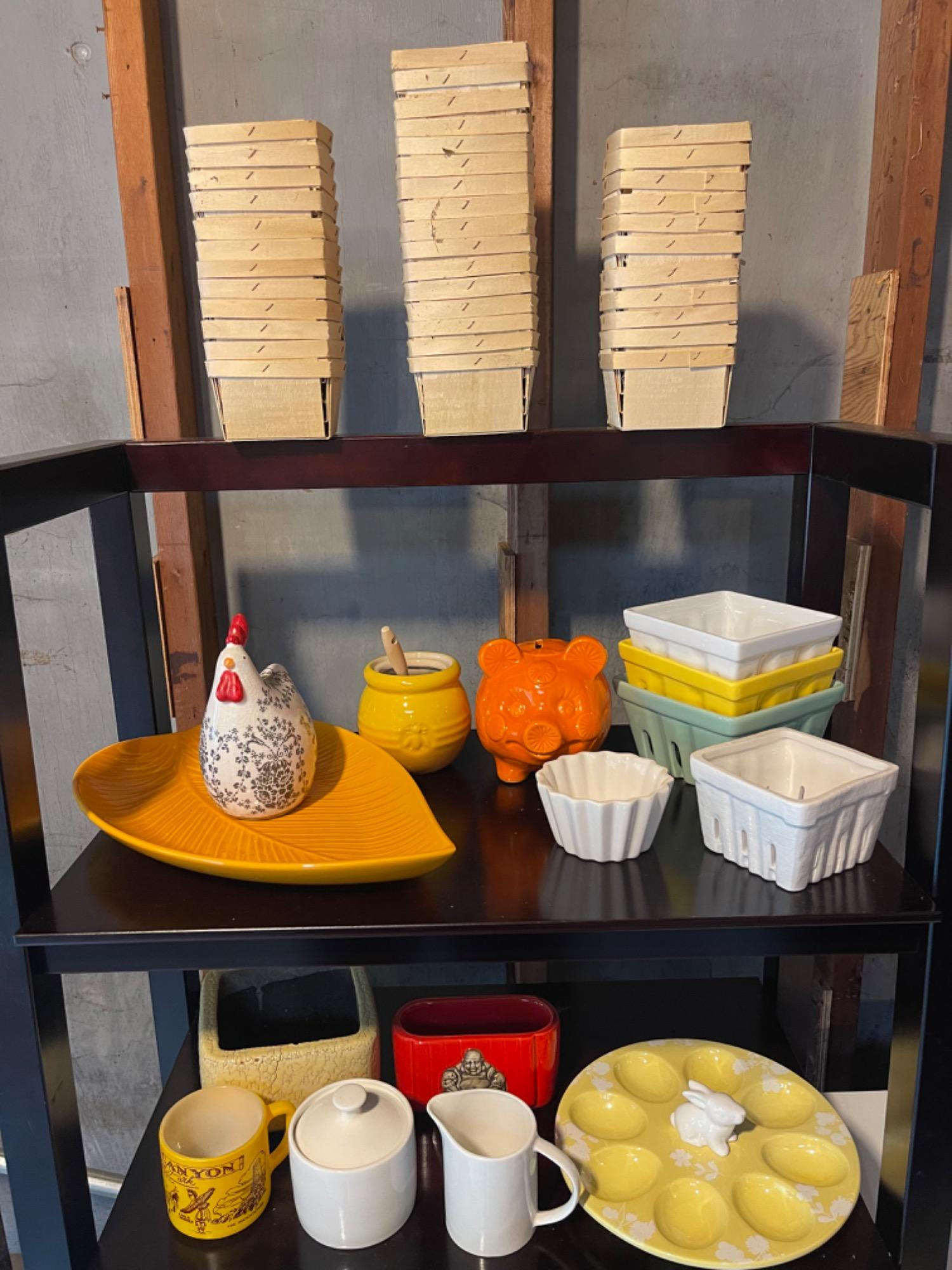 Bright Kitchen Items-Containers, Decor and Essentials. Egg caddie, kitchen chicken, Berry containers (wood and ceramic),leaf serving tray, honey jar and creamer/sugar jar. All shown. Good used condition. Honey jar is Le Creuset.