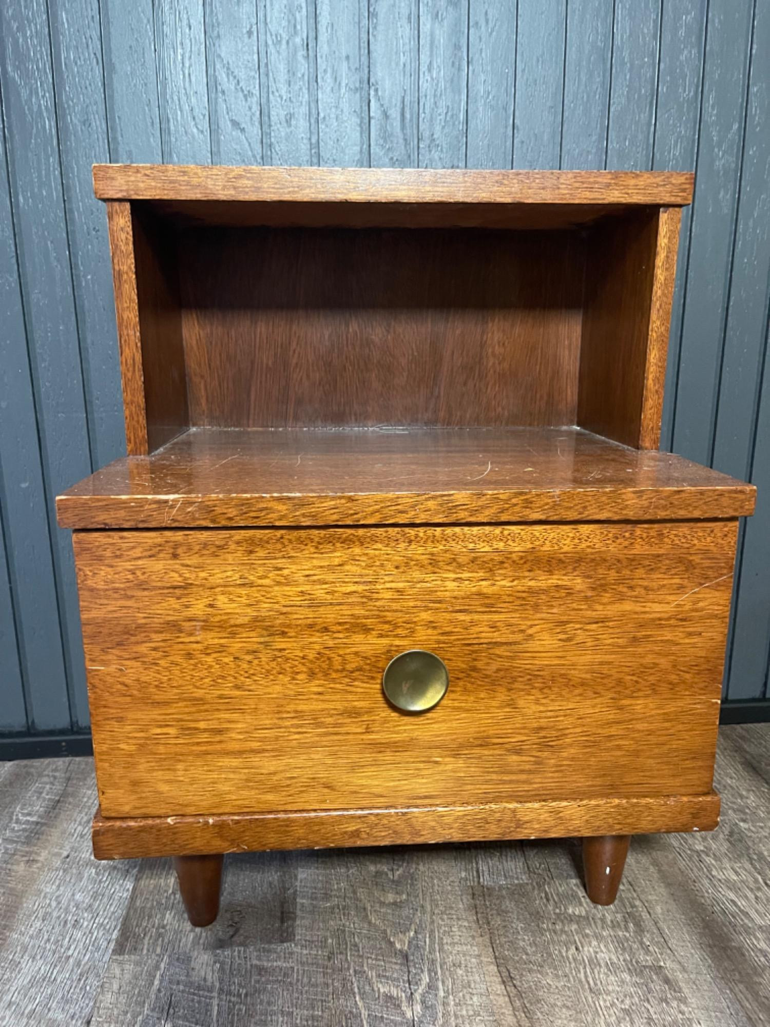 Mid Century Style Wood Side Table Has some scuffs and scratches but in otherwise good condition.