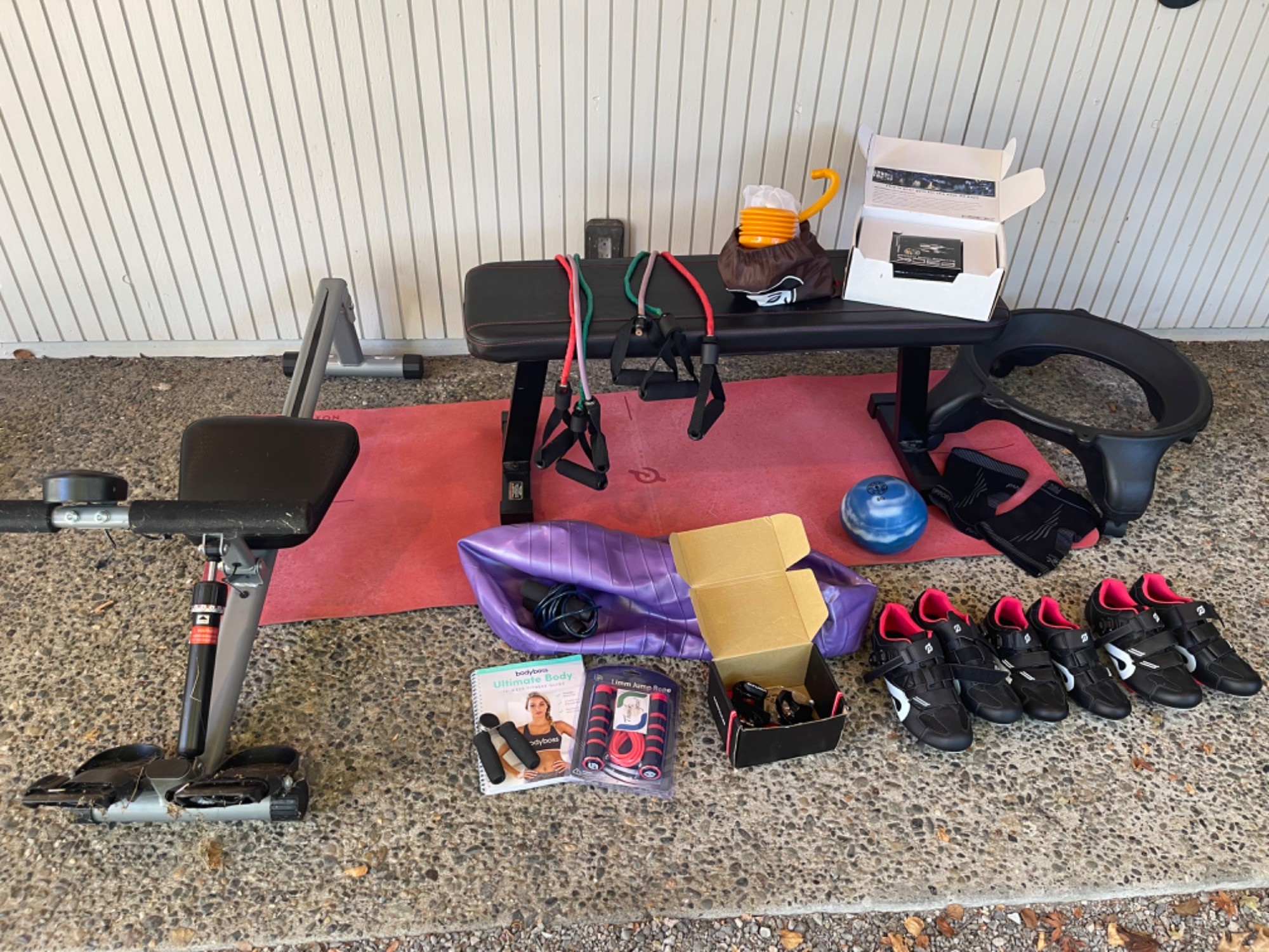 Exercise Lot- Work Out Bench, Fitness Program, Peloton Shoes-Much More New Peloton clip on shoes - sizes show in pictures. Jump Ropes, Mat, fitness rower, exercise ball with roll stand, weighted ball. This lot would be a great lot to add to your home gym!