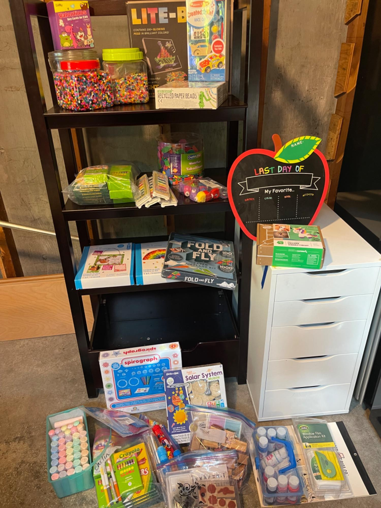 Lots Of Kids Crafts and Supplies- Most Are NIB Display shelf and white table NOT included There is a lot of fun in this lot. Paints, markers, crayons, spirograph, stamps, paper airplane kit, sidewalk chalk, bead art kits and so much more. Take a look! Even some adult items: window application kit