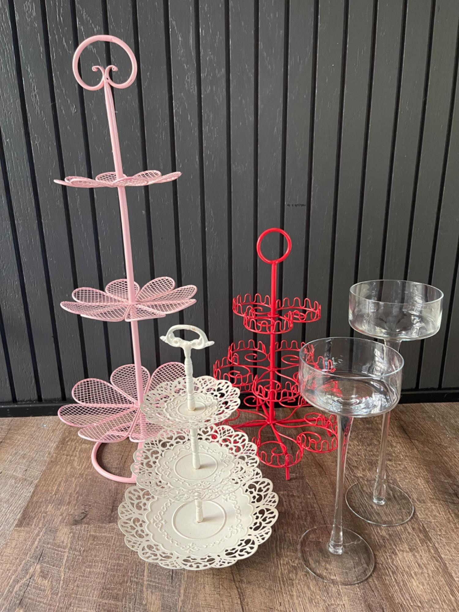 Tiered Serving Platters and LARGE Decorative Cocktail Glasses All good used condition. Shortest item: 13" H Tallest item: 26.5" H