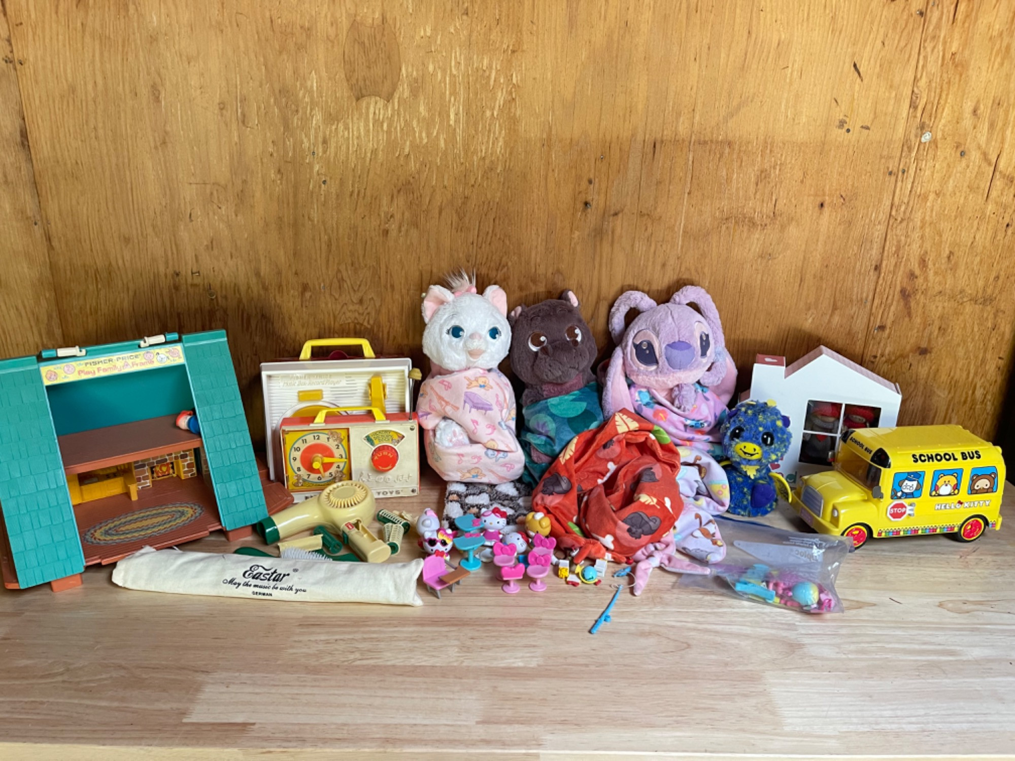 Assortment of Kids Toys - Hello Kitty, Fisher Price, Disney Plush Toys & More! All in good used condition. None have been tested. Records NOT included with Fisher Price Record Player,