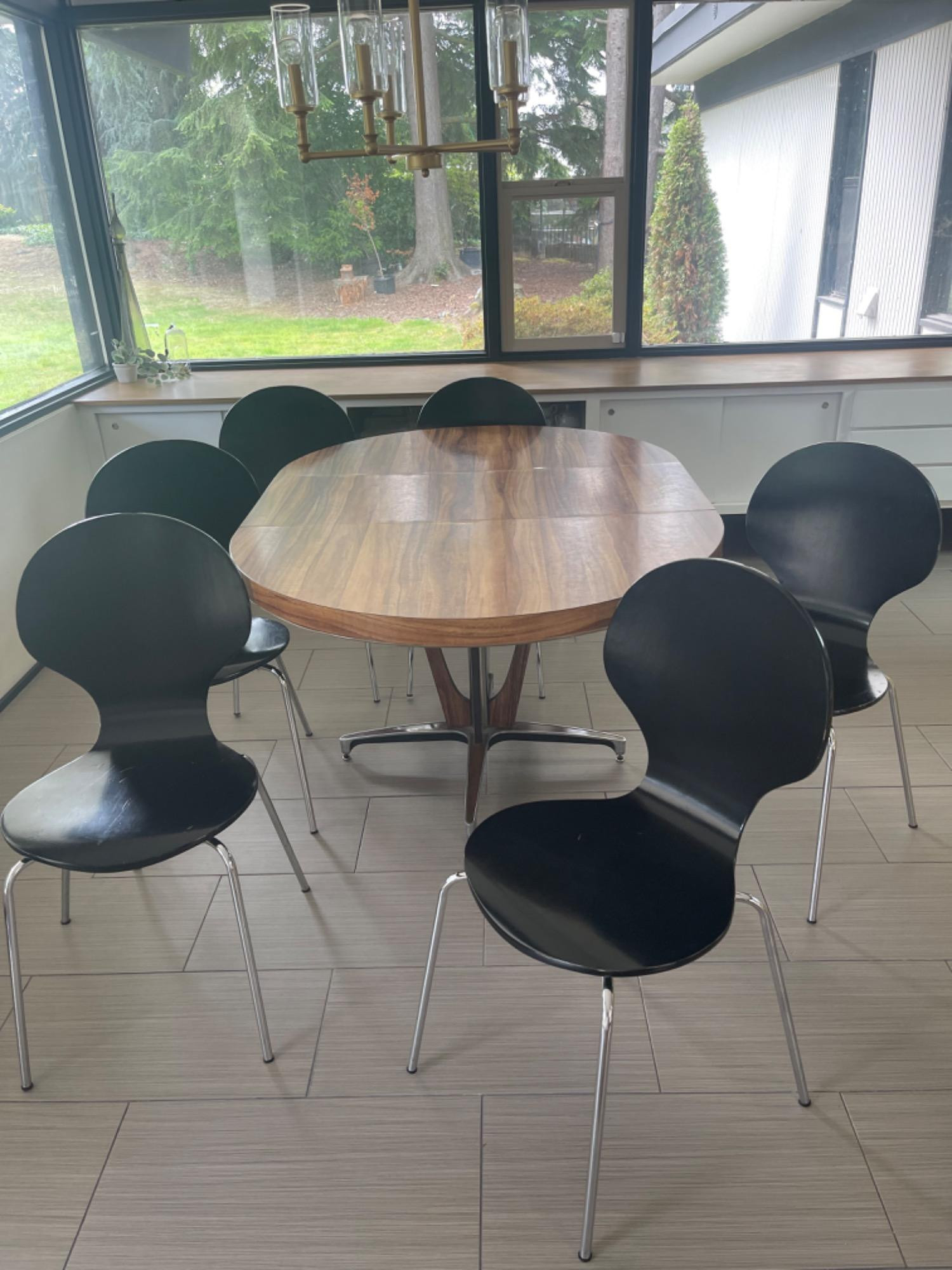 Vintage Dining Room Table With Six Mid Mod Style Chairs Many scuffs and scratches to this table. Very used. Chair measurements: 17" L x 16" W x 35" H