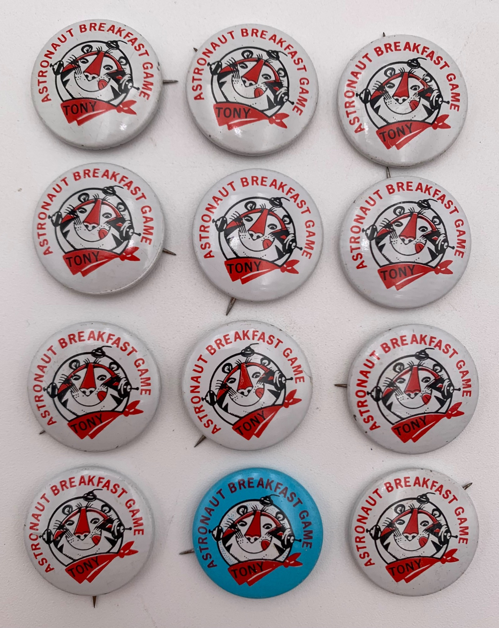 litho pinback buttons from the 1960s – 11 white & 1 blue.