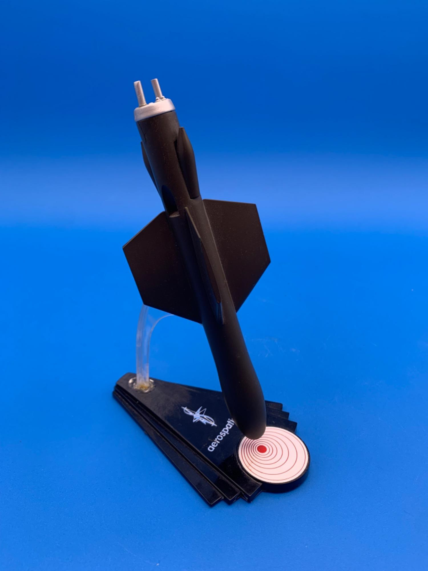 the missile’s body. The missile itself has only minor scrapes here and there that don't show when displayed plus a bit of discolored glue & small chip in the silver paint at its very bottom. The base is more worn; there are obvious glue repairs where the pillar connects to the base as well as some wear at the same place on the black plastic surface. Separates into 2 sections. Measures 7.5” H x 5” W x 3.5” W.