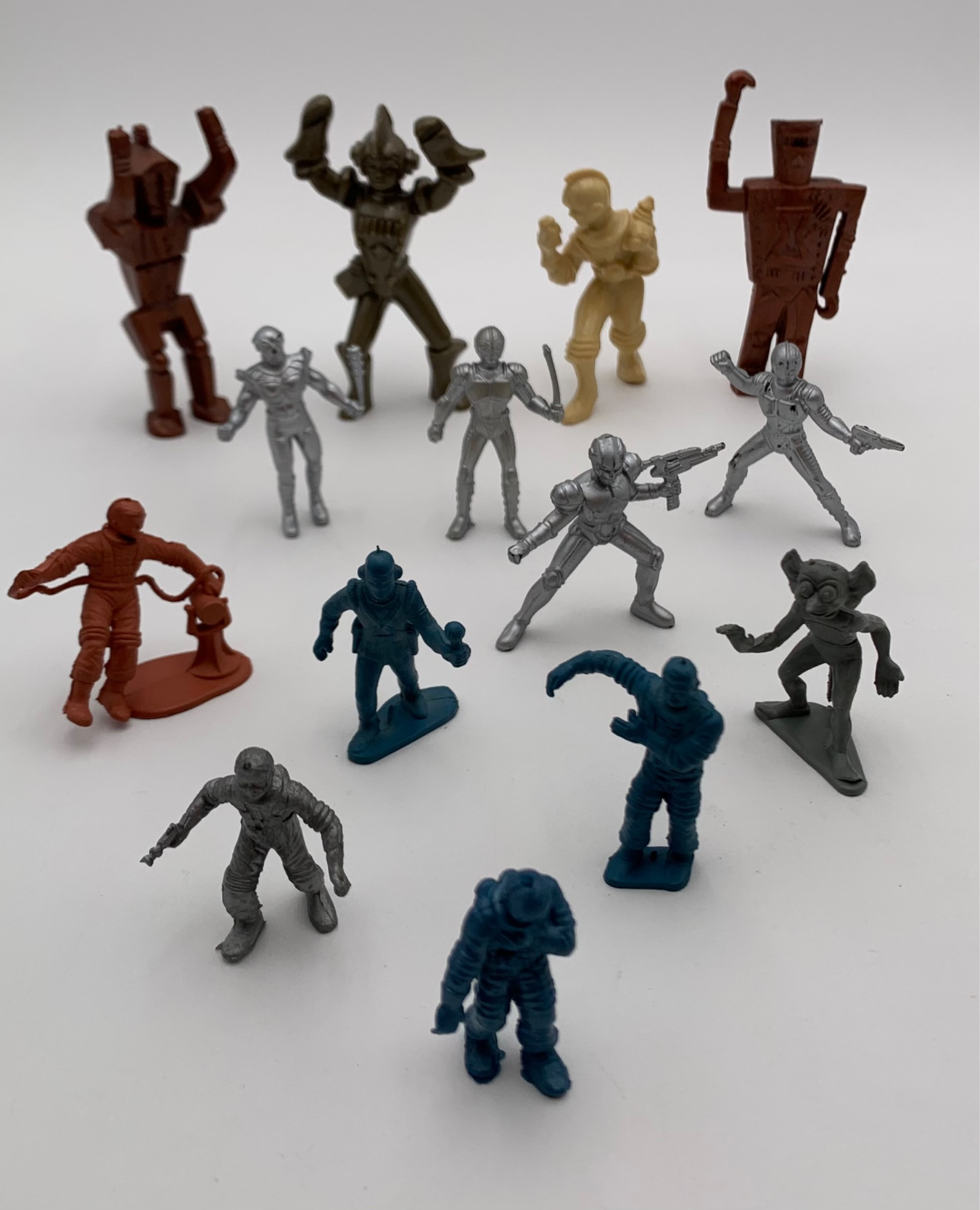 4 large spacemen/robots. One has a Glencoe mark (the robot with