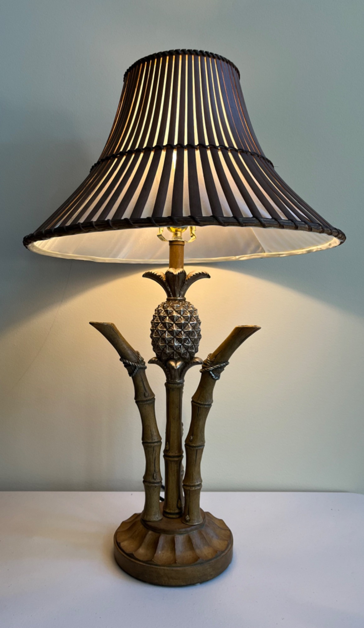 Bamboo Pineapple Lamp Ceramic "bamboo design" base - Dia: 7” Fabric shade w/ bamboo structure overlay Cast metal pineapple & pineapple finial 18” x 30”