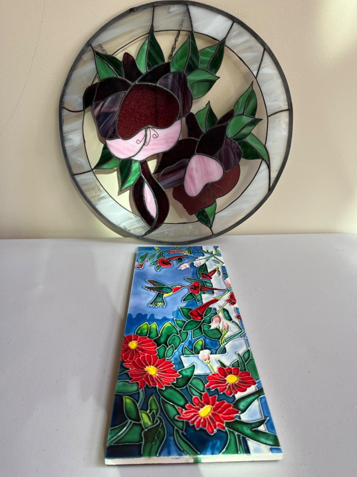 Lot # 22 - Stained Glass Window Hanging & Ceramic Hummingbird Wall Art