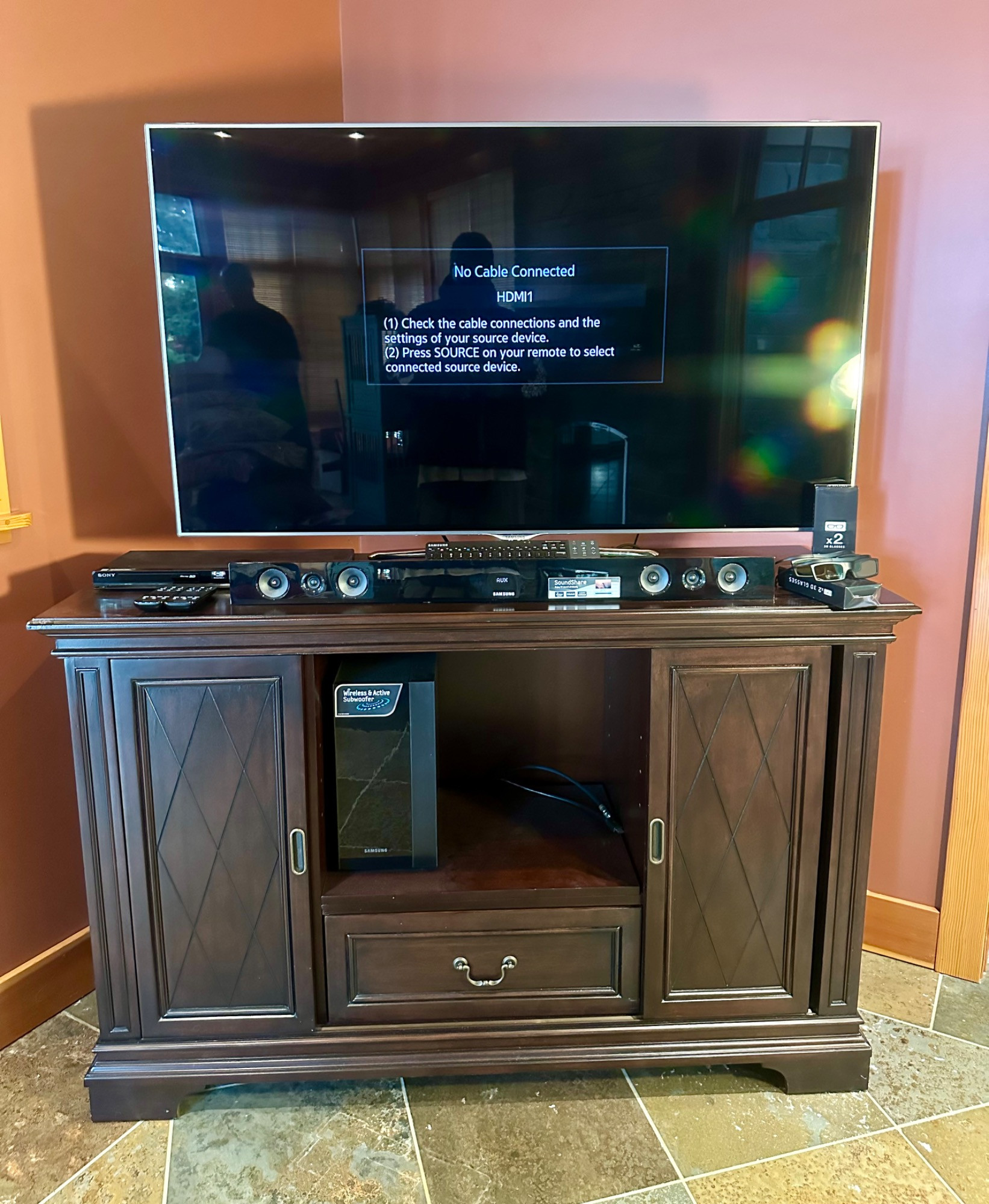 3-D Entertainment System / TV Stand Sony Blu-ray 3-D Dvd / Remotes Samsung Sound Bar / Woofer with Remote 2 Pair of 3-D Glasses