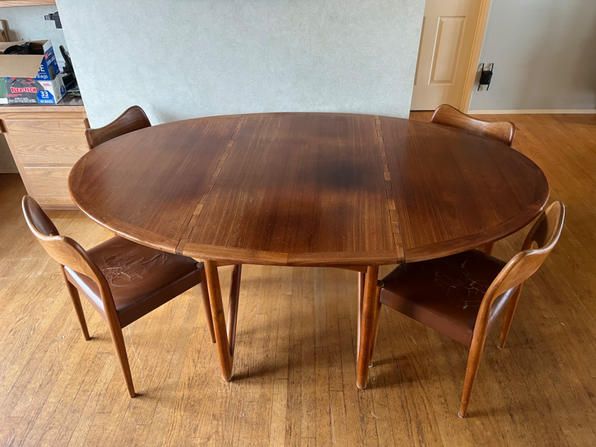 The legs can be rotated at both ends so that the ends of the plate can drop vertically. The 4 chairs appear to be Arne Hovmand-Olson for Mogens Kold chairs. Could not find markings but they are very well built. All four Seats need to be reupholstered.